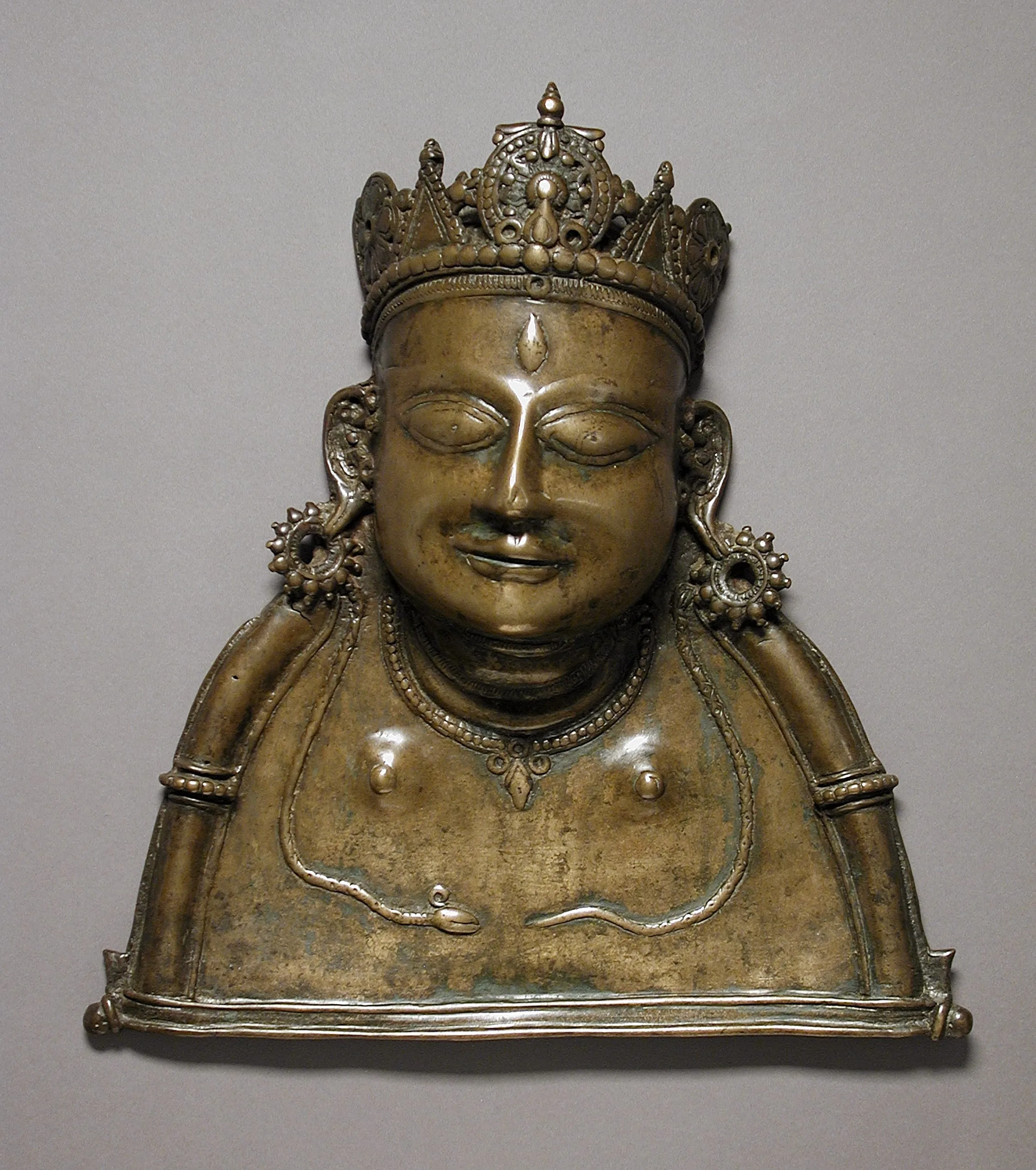 Processional busts, popularly known as masks (mohra), are carried on palanquins in Hindu religious fairs in Himachal Pradesh, particularly during the Dussehra festival held in October in Kullu. They are displayed in groups on wooden frames covered with brocaded silk and cotton. This bust of the Hindu goddess Mujuni Devi (variant name of Mahadevi) depicts her wearing an elaborate crown with lotus medallions alternating with pyramidal forms, circular studded ear ornaments, a beaded necklace with a quadripartite pendant, armlets on her thin arms along the outer sides, and a serpent draped around her neck. She has a wide face, large almond-shaped eyes, a third eye in her forehead, and pronounced nipples. The bust has been stylistically attributed to the Cis-Sutlej region (?), in present-day Panjab, India, circa 1400. (M. Postel, A. Neven, and K. Mankodi, Antiquities of Himachal (Bombay: Franco-Indian Pharmaceuticals, 1985): 208, fig. 328).