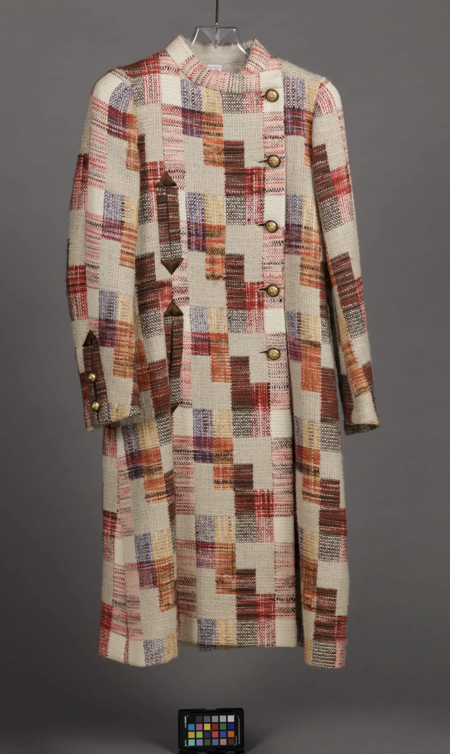 - Wool plain weave with silk embroidery and plastic buttons