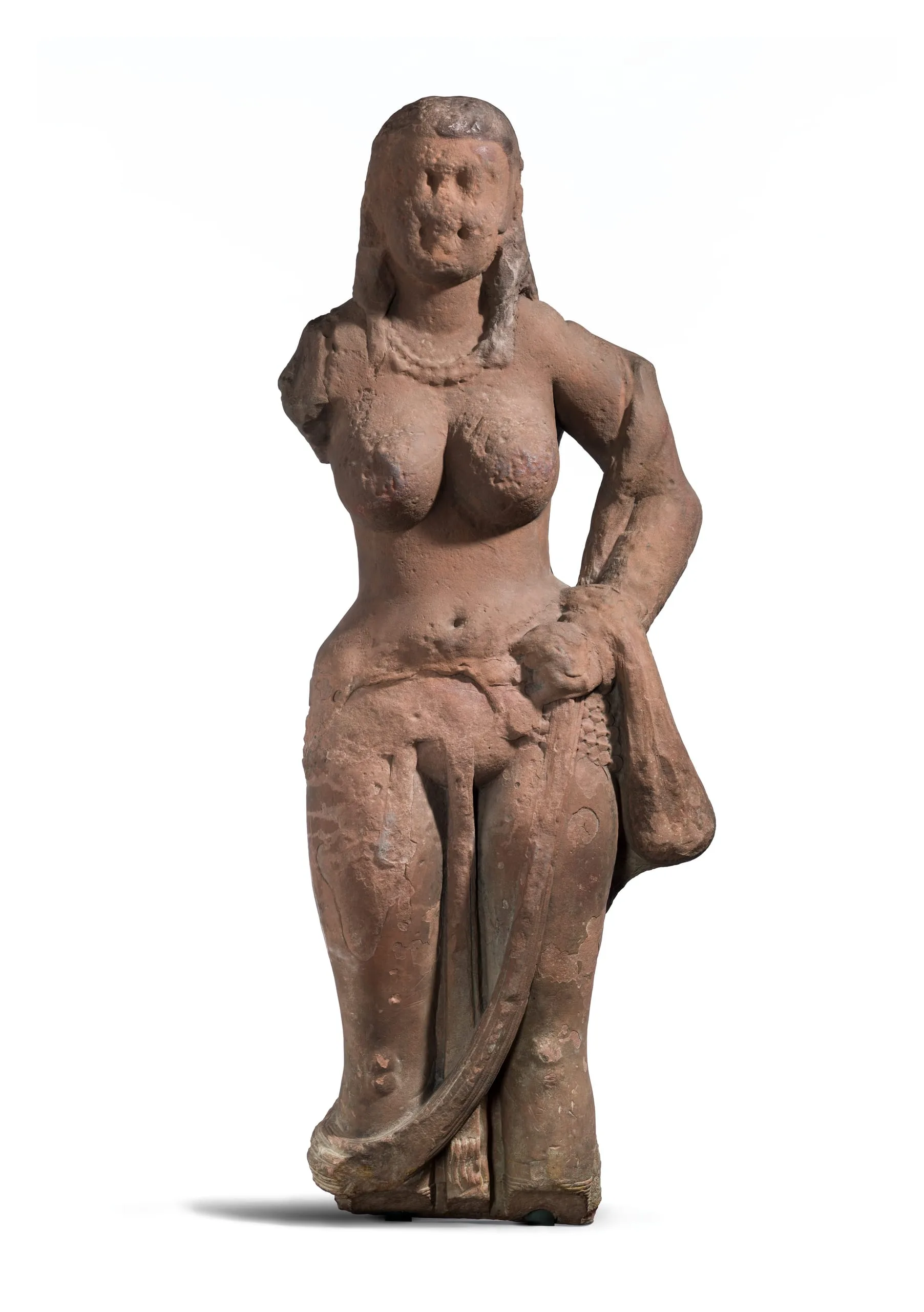 This larger-than-life figure of a nature goddess (yakshi) was likely originally erected in an outdoor shrine and circumambulated by devotees. They are particularly associated with sacred trees, particularly the Ashoka tree (Saraca asoca), and also serve as tutelary deities associated with Kubera, the god of wealth.