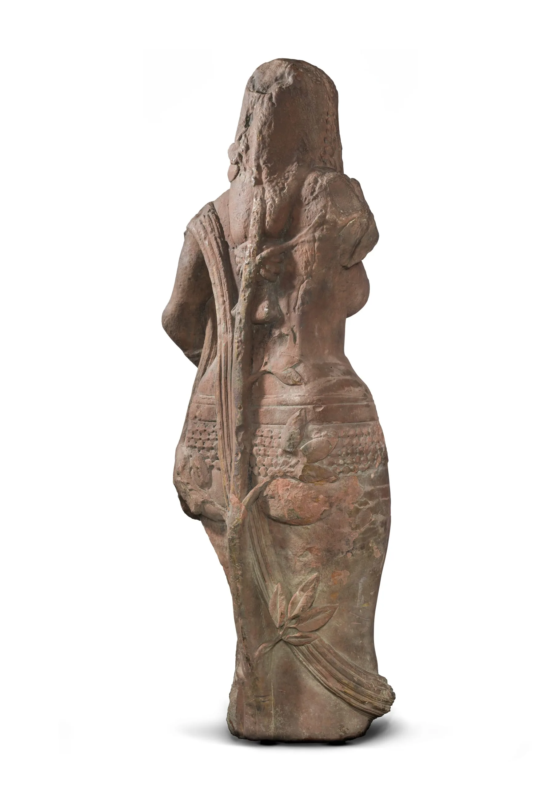 The goddess stands erect with her clenched left hand on her hip. Her now-missing right hand was probably held in the gesture of reassurance (abhaya mudra). She is full breasted and wears a lower garment secured by an ornate hip belt (katibandha). She stands up against an Ashoka tree (visible on the rear), which reinforces her close connection to nature.