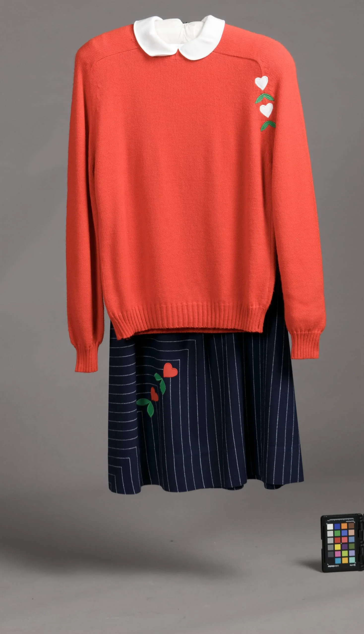 - Sweater: acrylic knit with wool flannel appliqués; Blouse: cotton knit; Skirt: wool twill with wool flannel appliqués