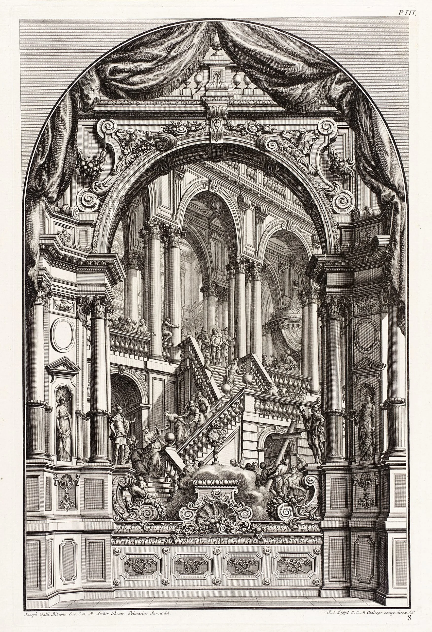 Engraving of an elaborate Baroque theatrical stage set with a grand arched proscenium, ornate double staircase, tall columns, and costumed figures