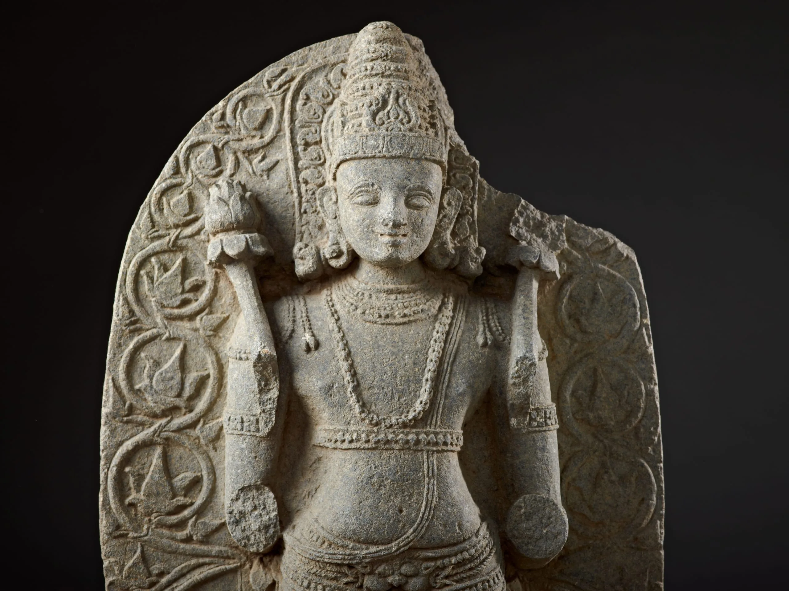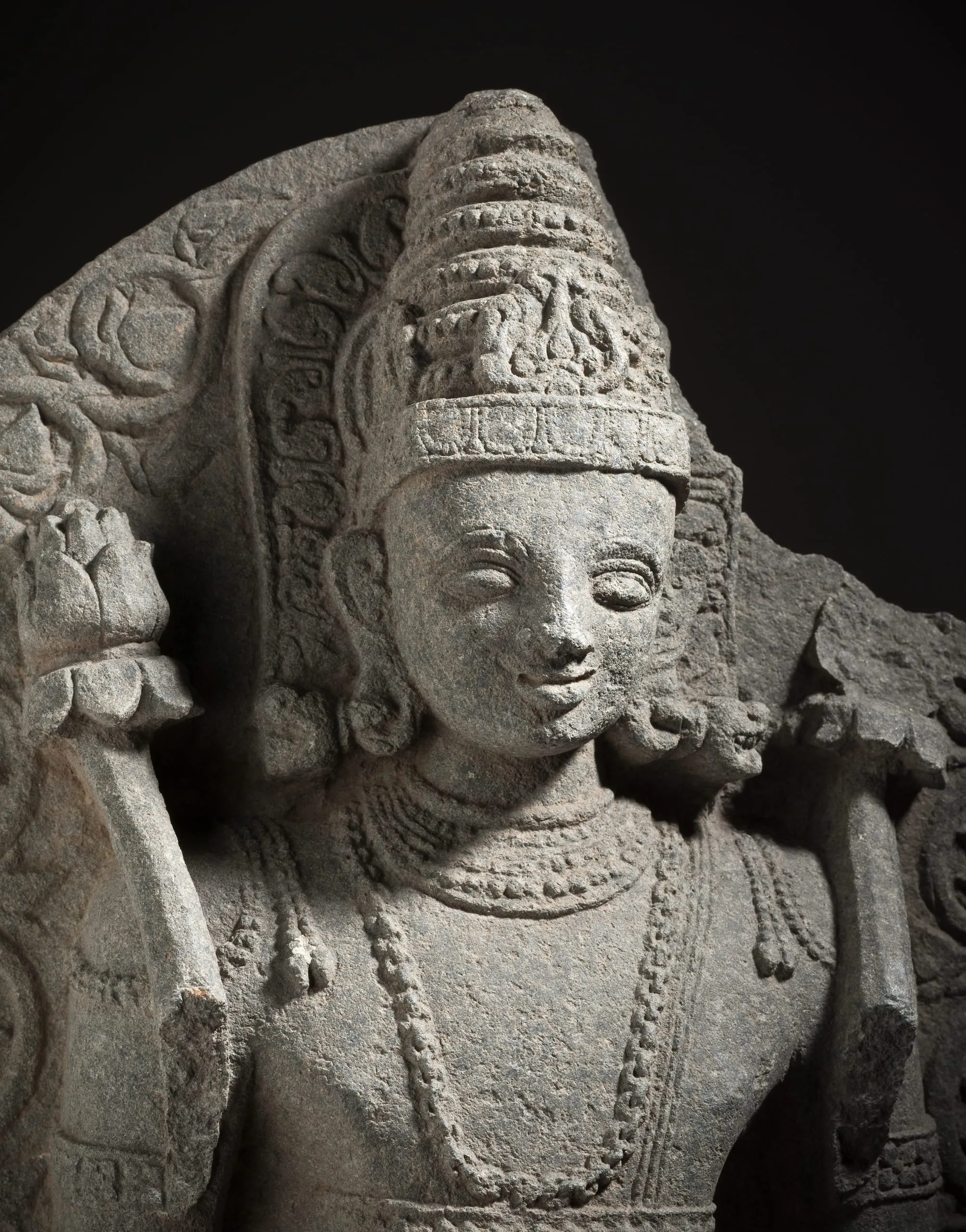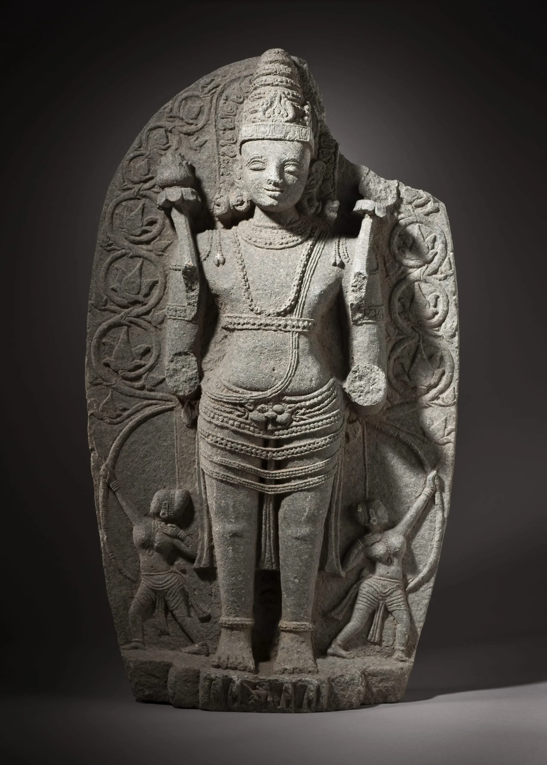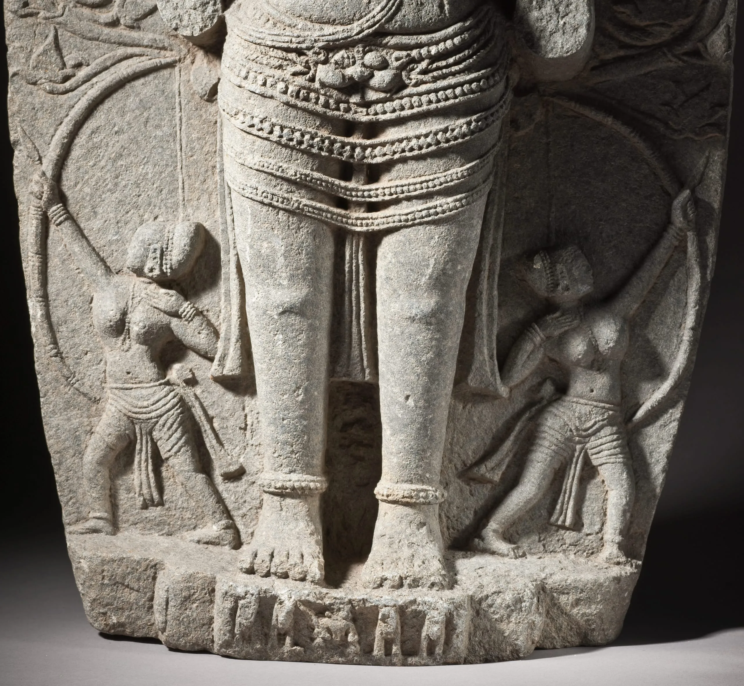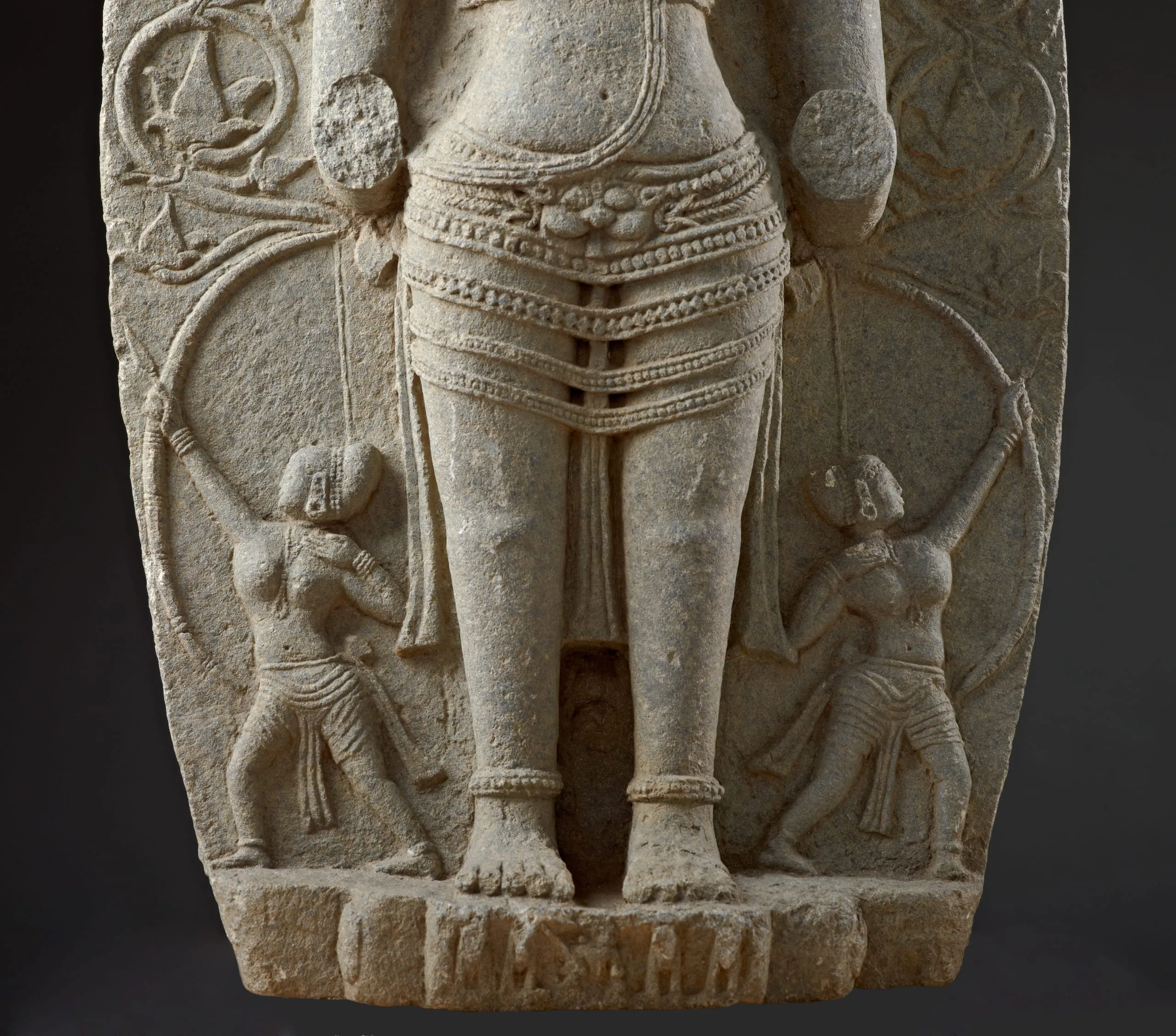 In this representation, Surya has a flaming nimbus carved in shallow relief. He wears a tall crown, earrings in the form of mythical aquatic creatures (makara kundala), and standard jewelry, including an ornate hip belt (katibandha) with a tiger head crest. He is barefoot and stands in a stiff, frontal pose (samapada sthanaka). He has two arms and holds a blossoming lotus in each of his now-missing hands. Surya is accompanied by two female archers, Usha (Dawn) and Pratyusha (Predawn), whose arrows dispel the darkness. In the center of the pedestal is Surya’s charioteer Aruna and four horses. The aureole is adorned with a scrolling lotus rhizome.