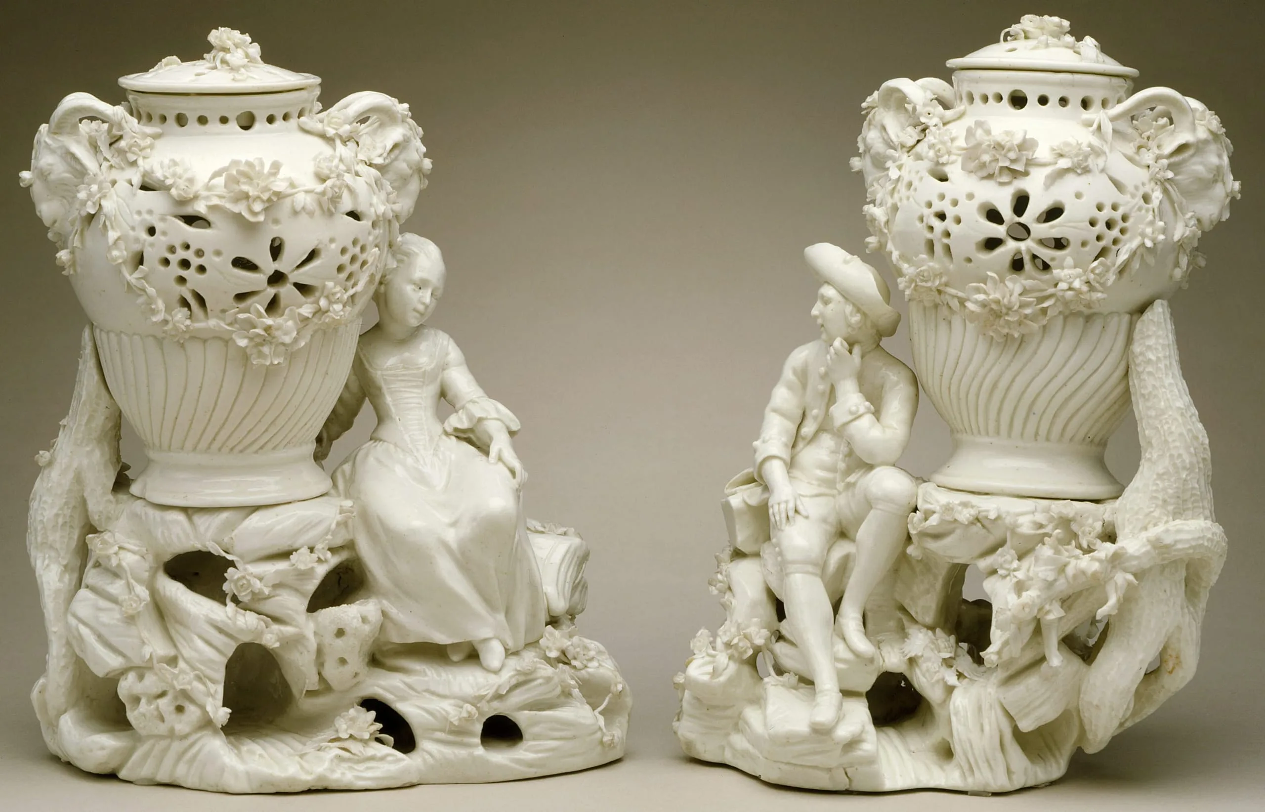 Much of French eighteenth-century art celebrates this new ease. The creator of this charming pair of vases has incorporated the rococo notion of elegant entertainment (fête galante) into a functional design. The flower-draped neoclassical urns were designed to hold sweet-scented potpourri; their pierced decoration is thus also practical.