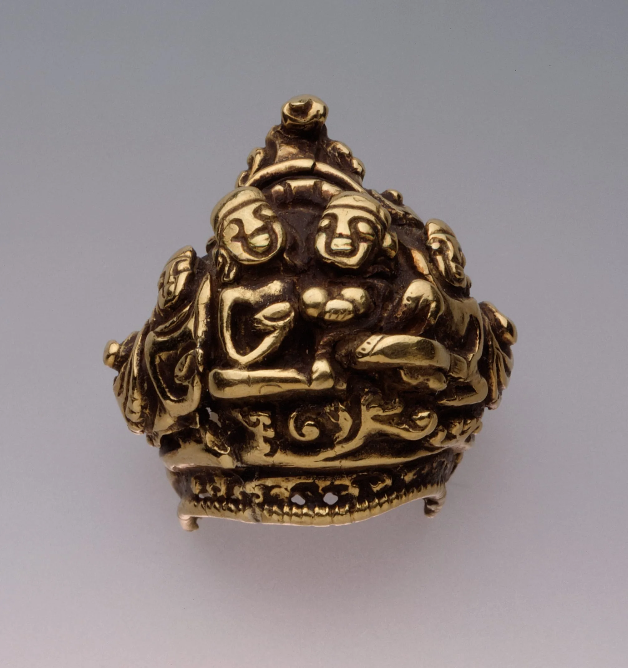 Closely comparable Indonesian gold figural rod finials or ear ornaments are in the Metropolitan Museum of Art, New York (1998.544.78) and Yale University Art Gallery (207.142.269).