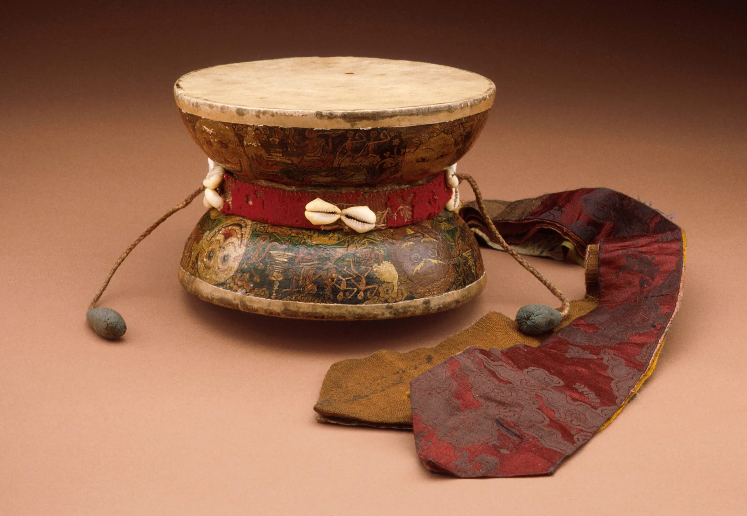 This pellet drum is made of two joined wooden drums with unadorned skin drumheads. The exterior of the drum is embellished with painted scenes of the eight cremation grounds featuring grinning skulls or fierce faces at the four opposite points. Between them are various dancing skeletons (chitipati; see M.91.203), Tibetan stupas (chöten; see M.76.130, M.82.200.3, M.87.53.1, AC1992.58.1a-b), ascetics playing thighbone trumpets (kangling; see M.81.90.19), and jackals and other scavengers. A necktie-shaped cotton and brocade silk banner is connected to the waist of the drum by a cotton band adorned with cowrie shells. See also M.85.298.2 and AC1998.34.1.