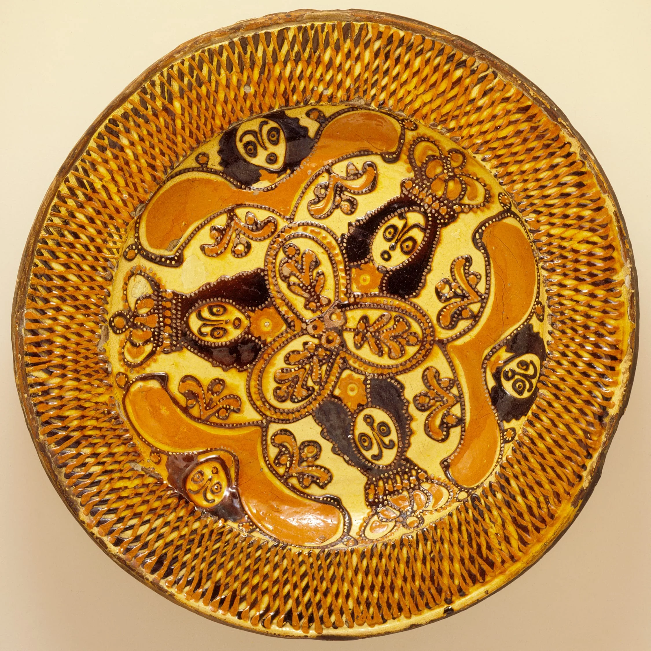 Slipware was produced in London by 1630, largely by Puritan potters inclined to decorate their work with lugubrious mottos such as Fast and Pray or Remember Thy End. The rare Staffordshire wares of Thomas Toft and William and George Taylor by contrast are notable for their trailed slip (liquid clay) decoration and dot-outline figures. A versatile medium, slip can be applied as paint or a dip, trailed, dripped, or applied with a knife and incised to expose the contrasting clay body.