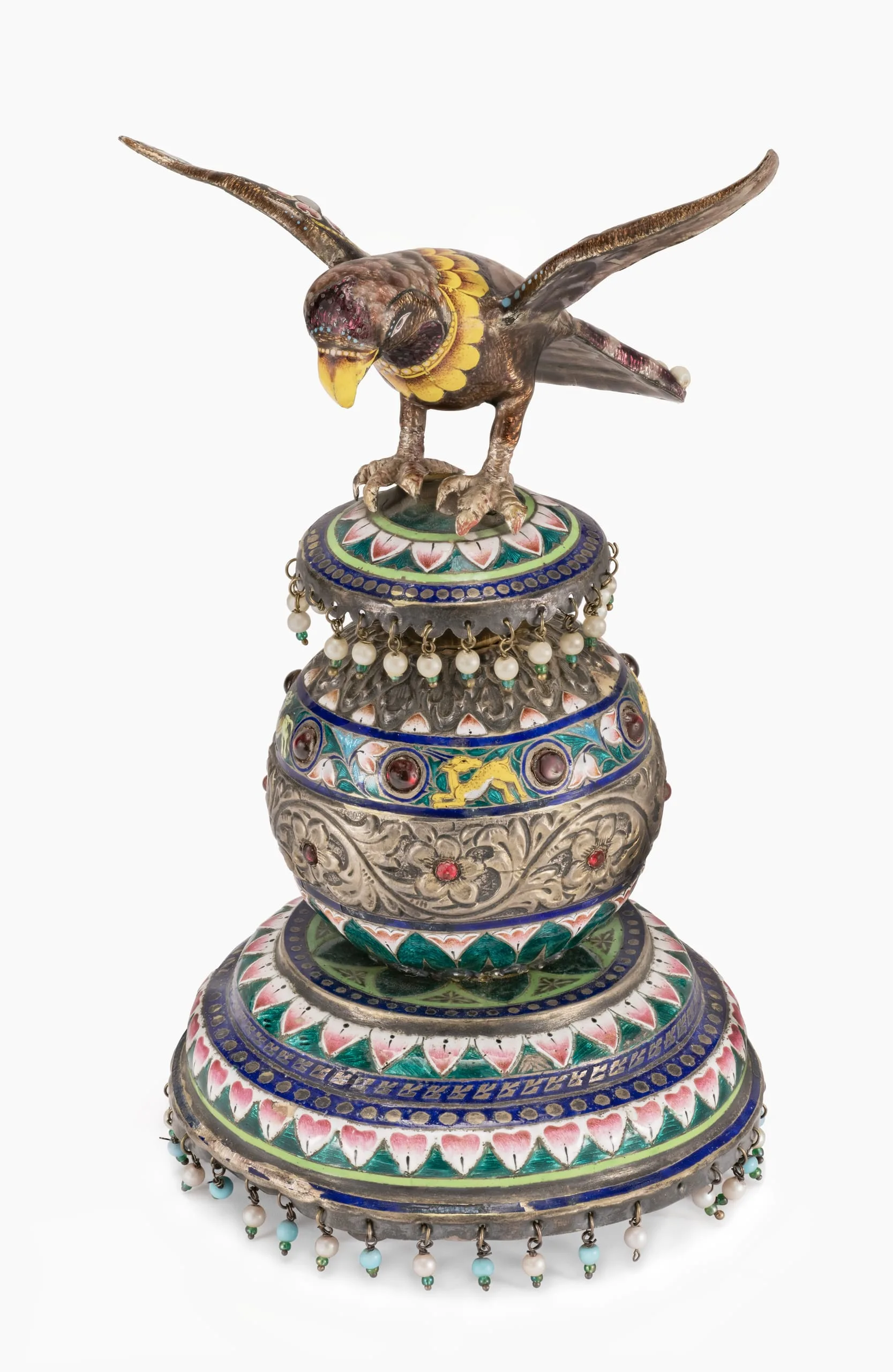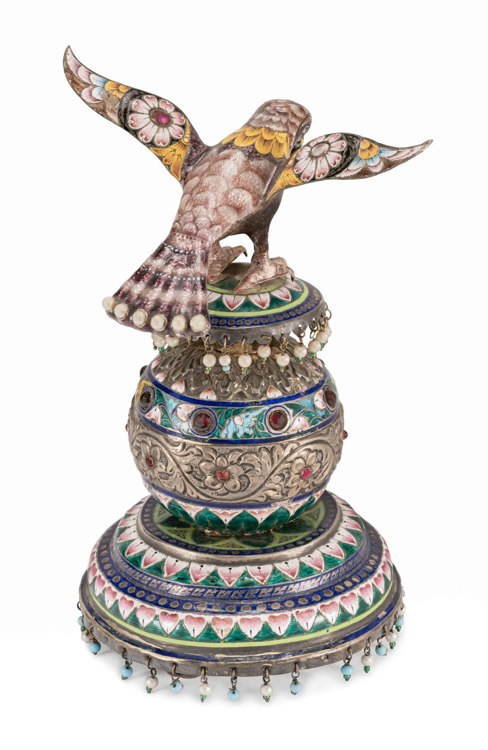 Reportedly once in the former royal collection of Bharatpur, Rajasthan, this graceful falcon is a tour de force of enameling. It features the delicate and rare pink enameling characteristic of Benares (Varanasi), as well as white, translucent mottled light brown, opaque yellow and shaded yellow, and opaque powder blue enameling. The separately fashioned silver repoussé columnar base, on stylistic grounds perhaps slightly later in date or by a different artist, also incorporates translucent green, opaque light green, and translucent blue enameling. A design register encircling the mid-base includes lively representations of a powder blue elephant and a yellow antelope.