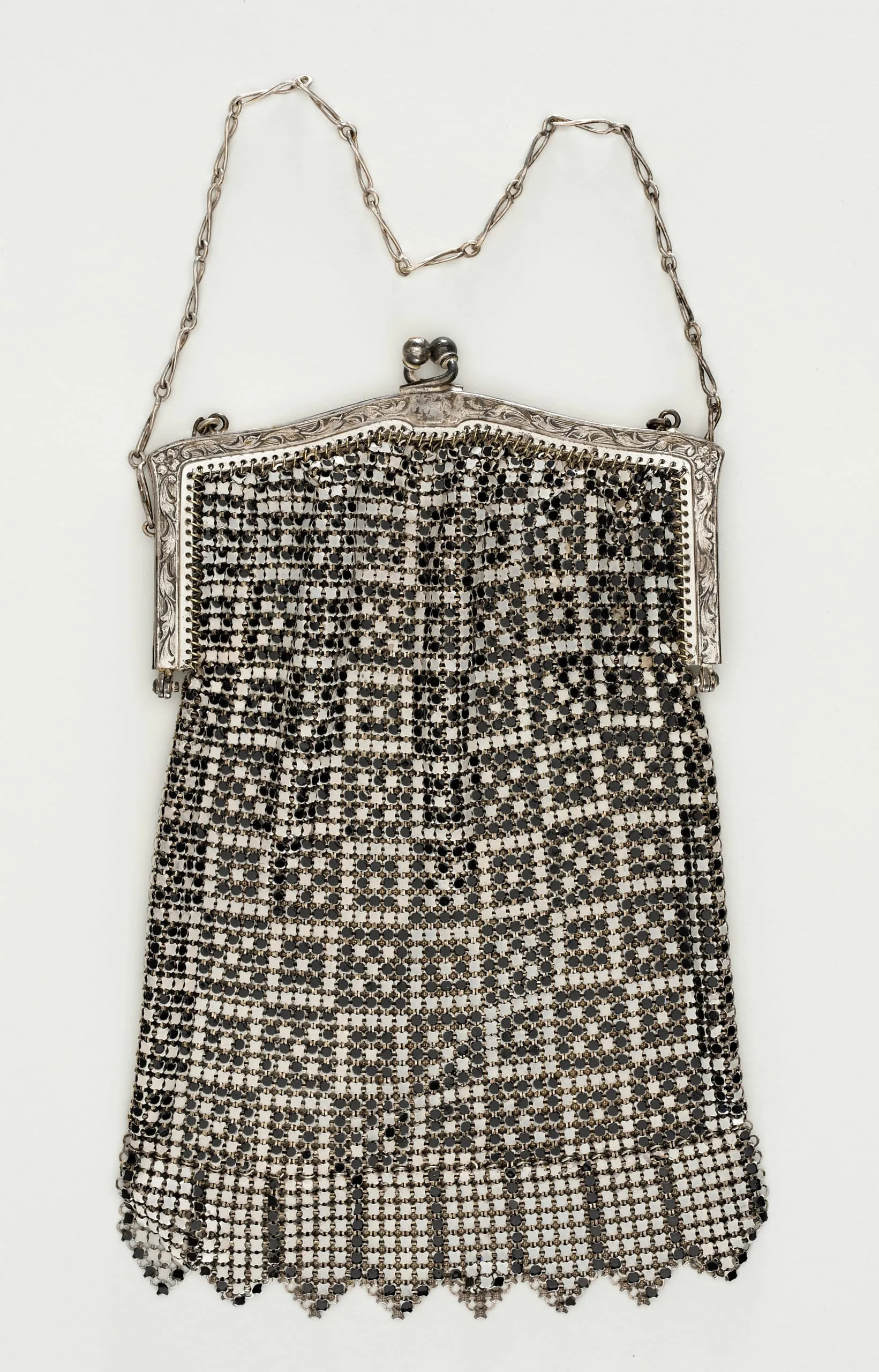 Silver-toned metal mesh handbag with geometric checkerboard pattern in dark and bright silver, scalloped fringe hem, engraved frame, and chain handle