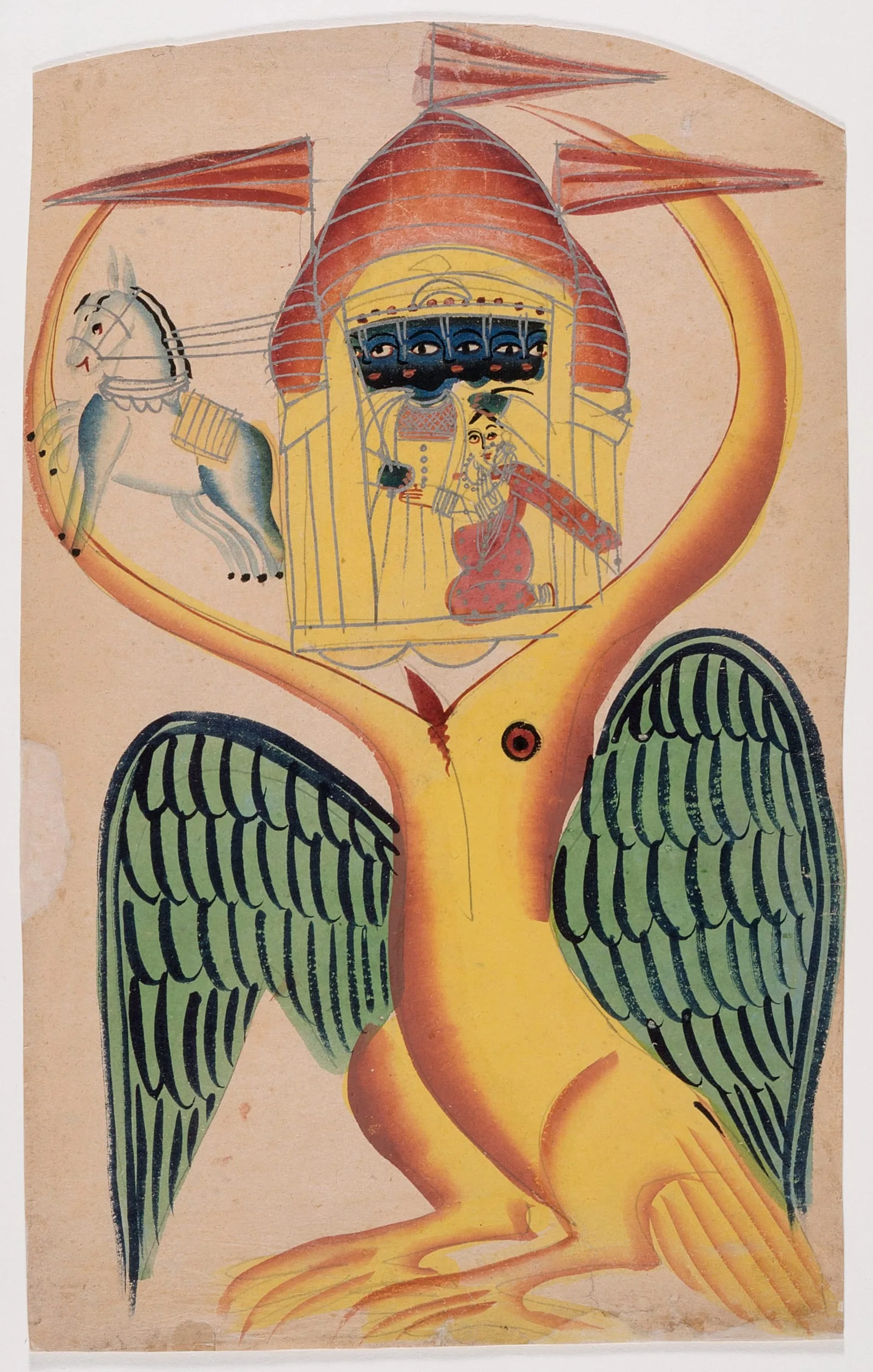 The Ramayana narrates the epic saga of the valiant Prince Rama and his dutiful wife, Princess Sita, who was abducted by Ravana, the arrogant ten-headed King of Lanka (probably modern Sri Lanka), during Rama's unjust fourteen-year forest exile. The Vaidehisha Vilasa (The Story of Sita), is a vernacular recension of the Ramayana written in the early 18th century by the Odia (Oriya) court poet Upendra Bhanja (1670-1740). A key idiosyncratic event occurs in the Vaidehisha Vilasa when Jatayu, the King of Vultures, valiantly tries to prevent Sita’s abduction by swallowing Ravana’s chariot in his beak, an act that is not narrated in the Sanskrit Ramayana ascribed to the legendary poet Valmiki or the Hindi Ramacharitmanas (Holy Lake of the Deeds of Rama) composed by Tulsidas (1511-1623) in 1575. But Jatayu was no match for the powerful Ravana and was mortally wounded in a fierce battle. Before he died, Jatayu was discovered by Rama and his brother Lakshmana, who were searching for Sita after having returned to their hermitage to find her missing. Jatayu told the brothers of Sita's kidnapping by Ravana. Rama rewarded Jatayu for his loyalty by performing his funerary rites so that he could ascend to heaven, which no vulture had ever attained. Jatayu’s heroic attempt was immortalized by Odishan (Orissan) and Bengali artists, who portrayed the deed in dramatic fashion by depicting Jatayu in larger-than-life proportions engulfing Ravana, his horse-drawn ariel chariot, and the captive Sita.