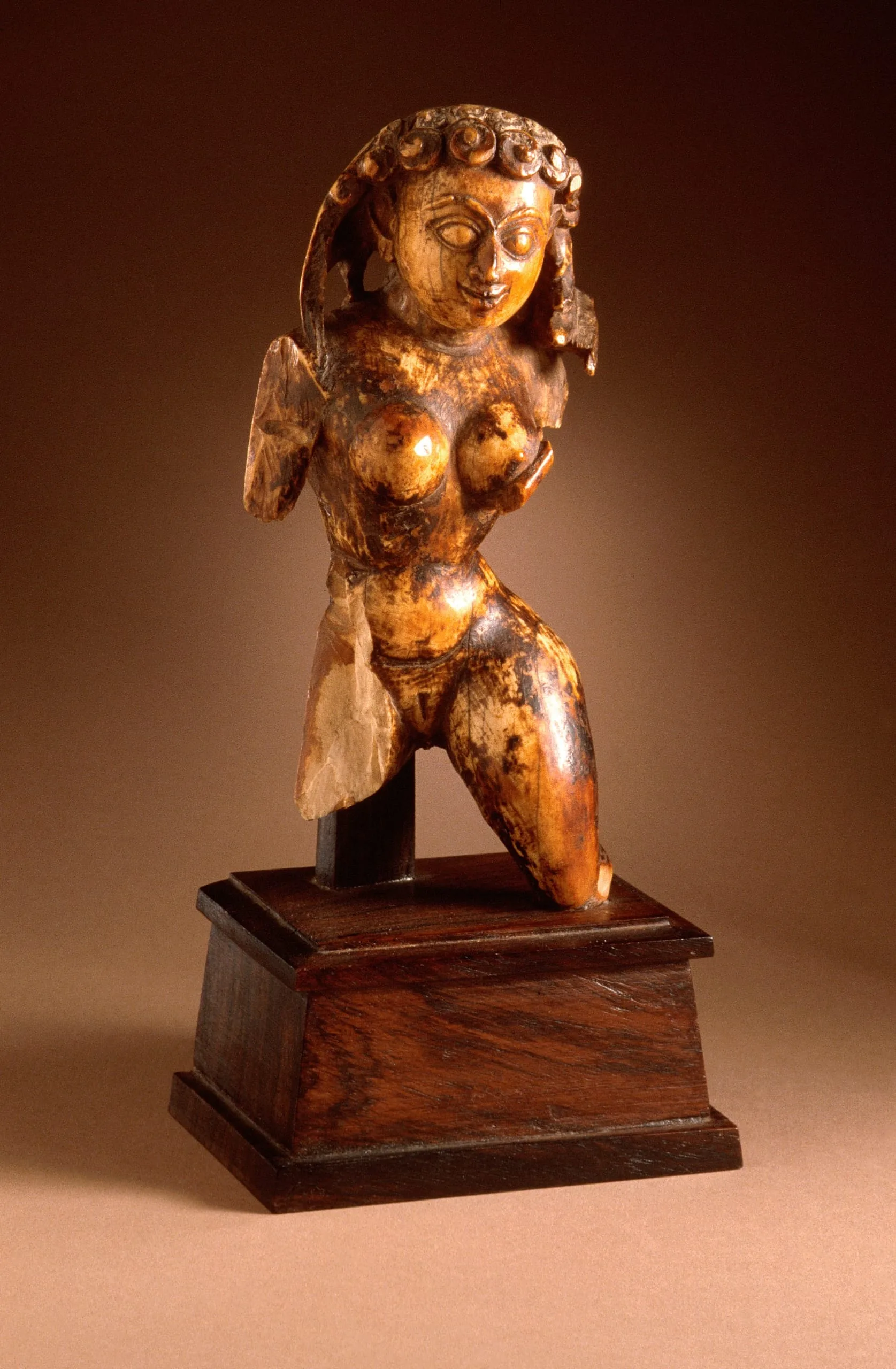 Cherubs, generally known also as winged infant putti, are supernatural celestial entities often portrayed in Greco-Roman and Christian art. They were assimilated into the South Asian artistic pantheon of demigods in the early centuries of the common era in the sculpture of Gandhara (for example, see M.89.159.3), and reintroduced in Mughal painting by the early 17th century (for example, see M.80.6.6). Ivory representations of cherubs from Madurai, often shown in flying postures with one leg bent back at the knee, are common accessory figures in larger compositions (for example, see M.80.232.8a-d) and as independent subjects in free-standing sculptures or as deeply cut reliefs presumably meant for embellishing furniture. This cherub was originally a musician judging from the remnants of a stringed instrument visible beside left breast and hair. She has the conventional facial features of Madurai cherubs, namely a distinctive hairstyle with large curls, wide-open almond-shaped eyes with prominent eyebrows, and the body of a plump toddler. Male and female Madurai cherubs are known, as well as loving couples (mithuna). A number of extant examples are now in the Minakshi Sundareshvara Temple Museum, Madurai.