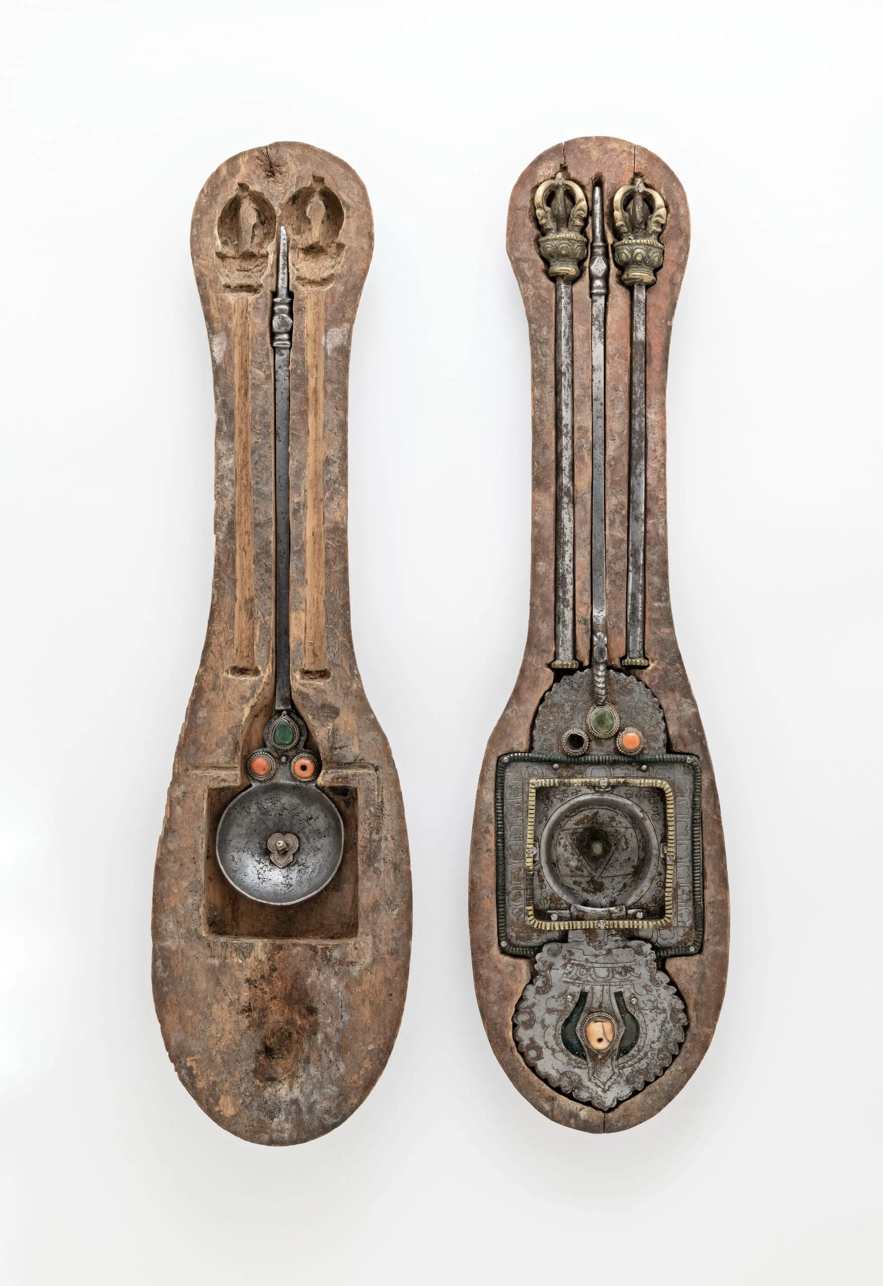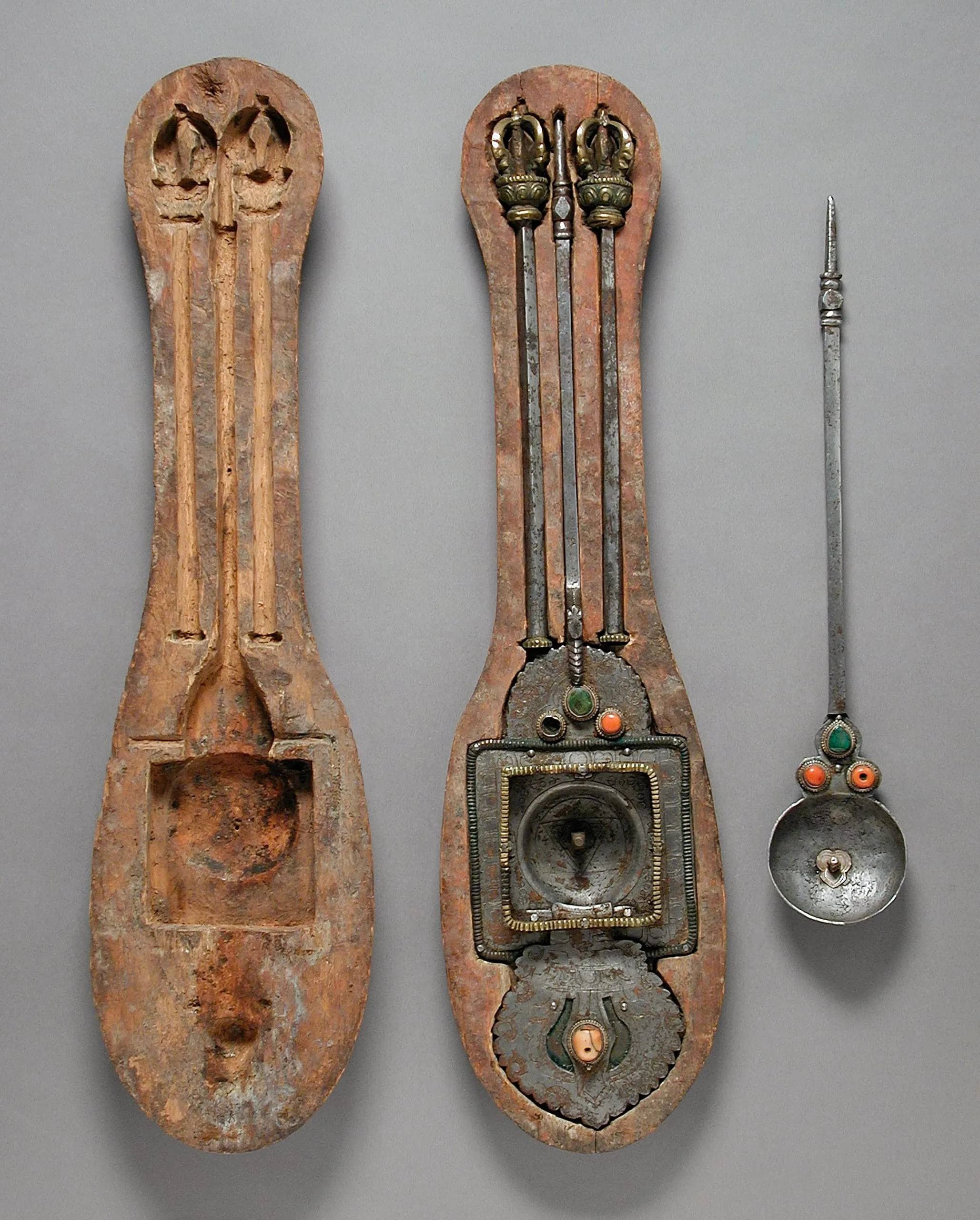- Steel, gilt copper, silver, coral, and turquoise; wood case
