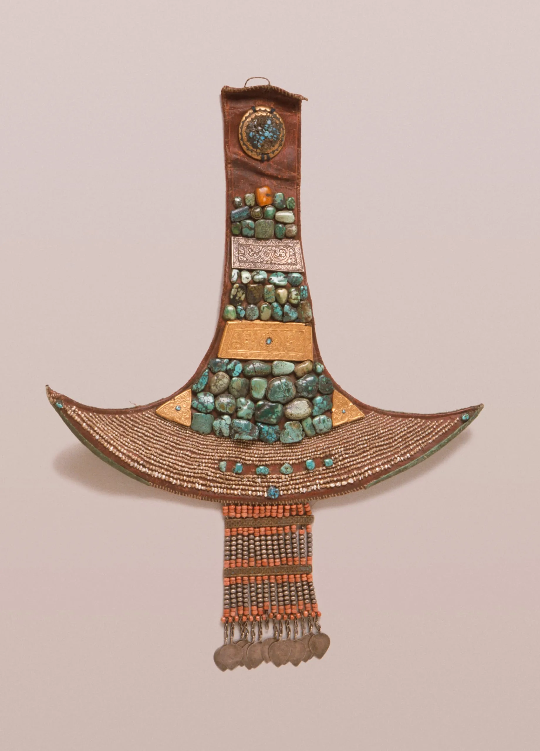 - Turquoise, pearls, amber, and coral beads with silver, gold, and copper alloy ornamentation on leather with cloth backing