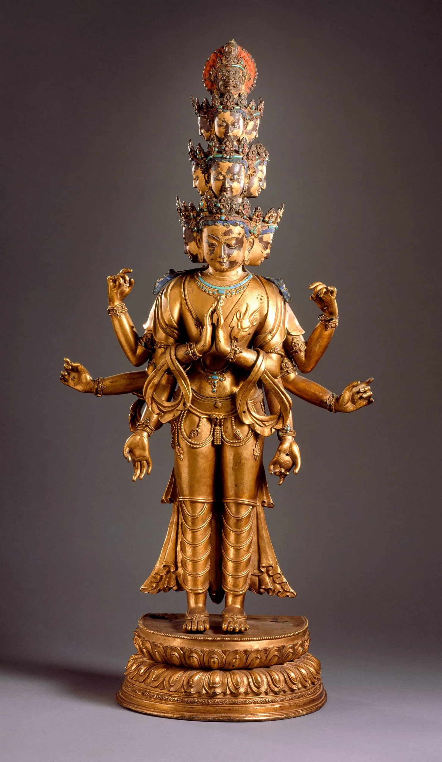 Avalokiteshvara, the Bodhisattva of Compassion, is represented here in his cosmic form with eleven heads emphasizing his watchful nature and six arms. Eight of the eleven heads represent the cardinal directions and their intermediate points, while the remaining three symbolize the zenith, nadir, and center. The eleventh head at the top represents the Buddha Amitabha, of whom Avalokiteshvara is considered to be an emanation. He symbolizes the universal compassion of all Buddhas. Apart from Amitabha, the ten heads represent Avalokiteshvara’s attainment of each of the ten Bodhisattva stages and also symbolize his watching over beings throughout the ten directions of space. All of the heads have benign faces except for the penultimate head, which is wrathful. He has eight arms, five of which are now missing their separately cast attributes. This lower left hand likely once held a water pot. His two primary hands are held in the gesture of adoration (anjali mudra). His lower right hand is held in the gesture of charity (varada mudra). He stands on a lotus base. The top of the base has two lug holes at the rear sides, which indicates there was originally a detachable nimbus and aureole (prabhavali).