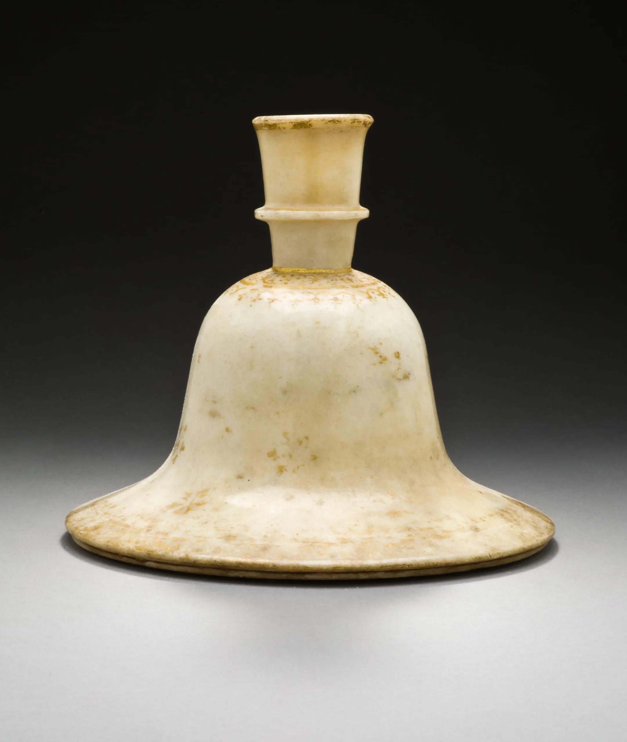 This bell-shaped hookah base is made of white marble with traces of gilded decoration on the rim of the slightly flaring mouth, the neck’s midpoint projecting molding used to facilitate carrying, the vessel’s shoulder and body, and the splayed foot of the vessel. The ornamentation on the shoulder and splayed foot is a scrolling vine with complex components consisting of a repeating pattern of parallel tendrils that form open-ended horizontal cartouches with foliate terminals. Interspersed between the cartouches are starburst designs with a central orb and six smaller orbs concentrically radiating outward on spokes. Beneath the shoulder is a necklace of hemispherical arches with floral pendants and a single orb floating in the arch’s interior apex. The same ornamental band is inverted and repeated above the scrolling vine band on the splayed foot. The vessel body has a diaper pattern of larger, more articulated starbursts or perhaps stylized six-petaled blossoms.