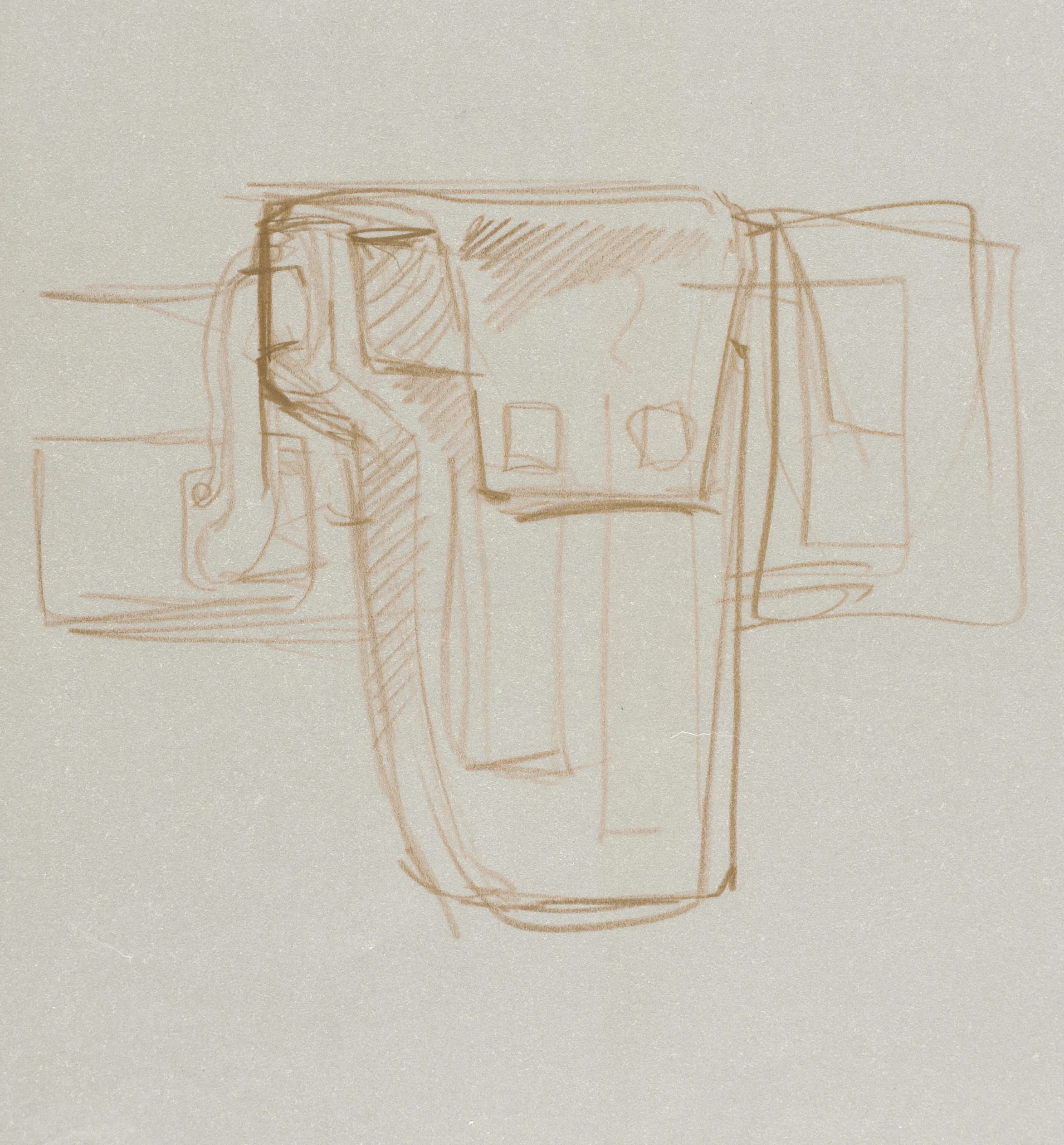 Sketch in tan chalk on pale gray paper, loose compositional study of a tall central form flanked by flat rectangular shapes, with hatched shading