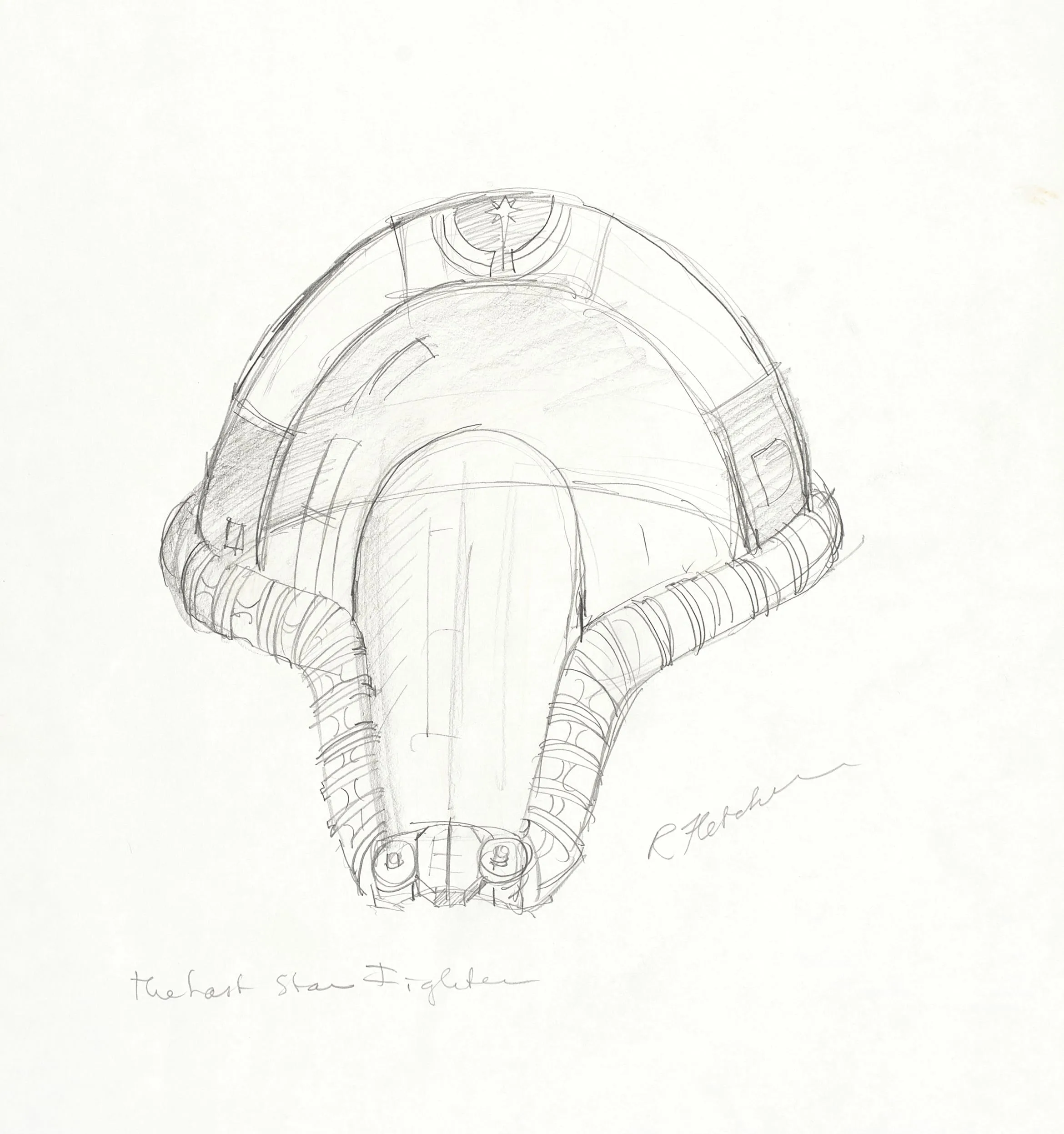 Pencil drawing on white paper of a dome-shaped futuristic helmet or cockpit, with segmented tubes curving from both sides to meet at the bottom, signed 'R. Fletcher'