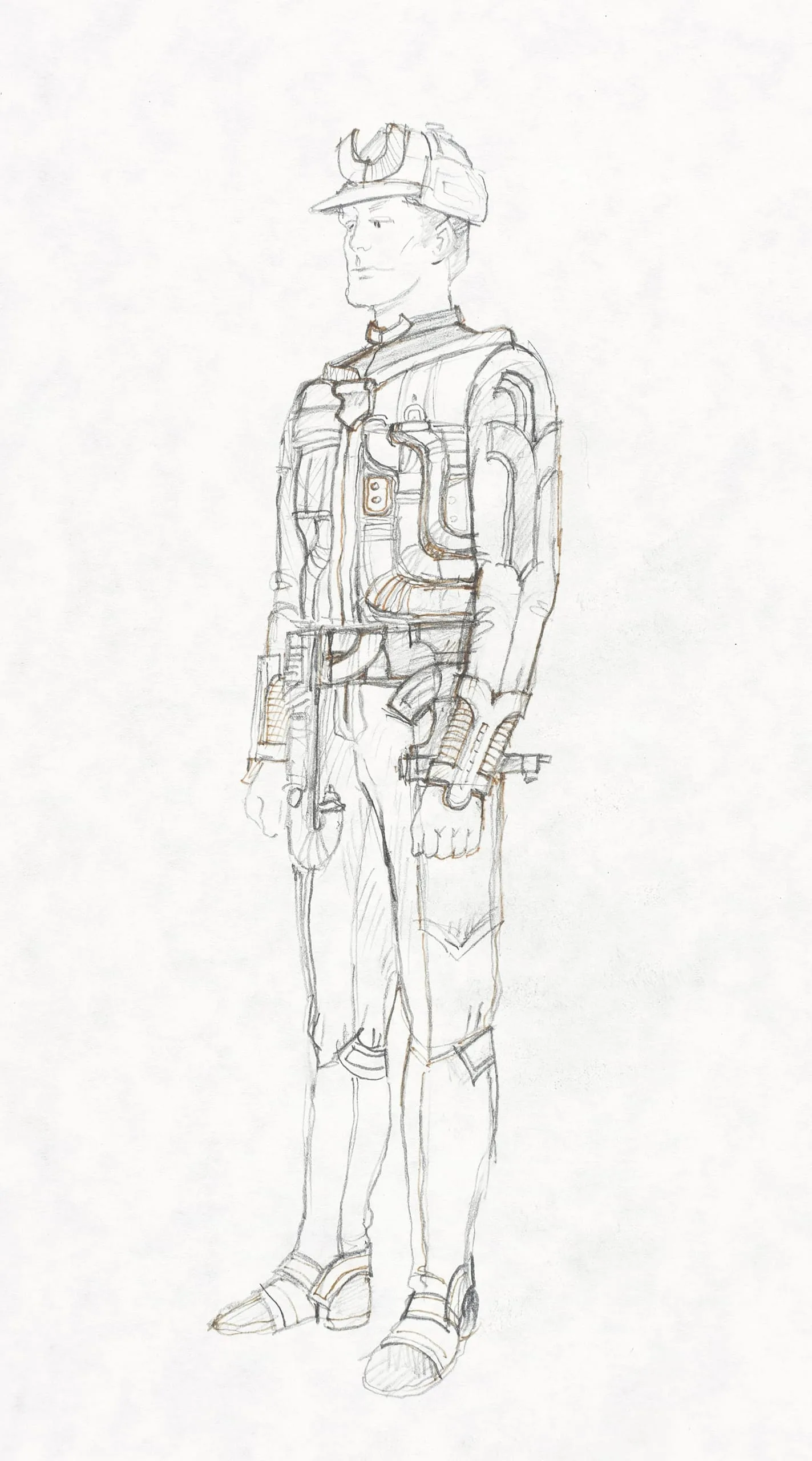 Full-length pencil drawing of a man in a segmented, futuristic uniform with helmet, chest unit, utility belt, and armored boots, with orange-brown colored pencil accents on equipment details