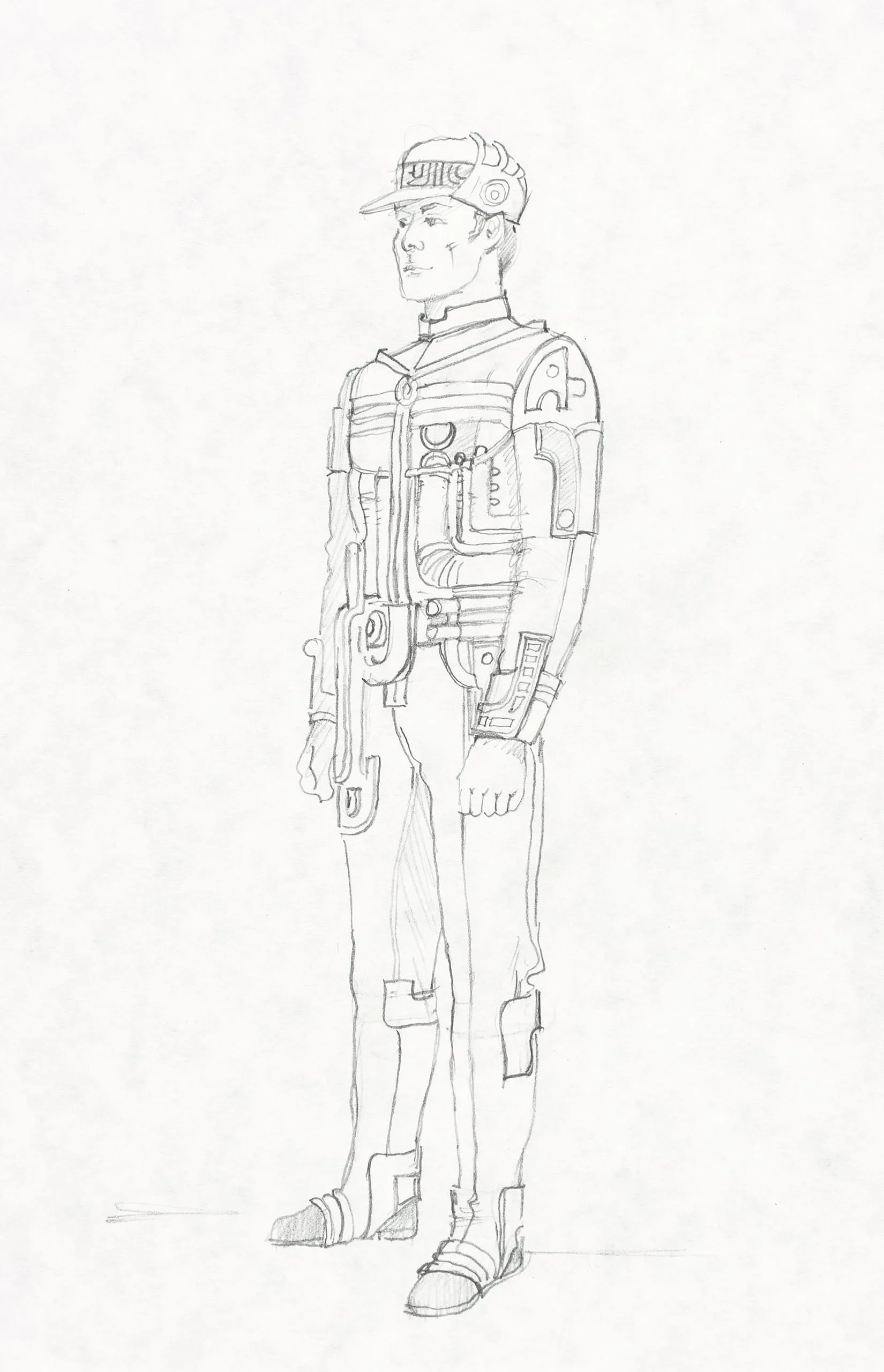 Pencil drawing on white paper of a full-length standing male figure in a detailed science-fiction suit with mechanical chest harness, forearm cuffs, holster, and flat-brimmed cap