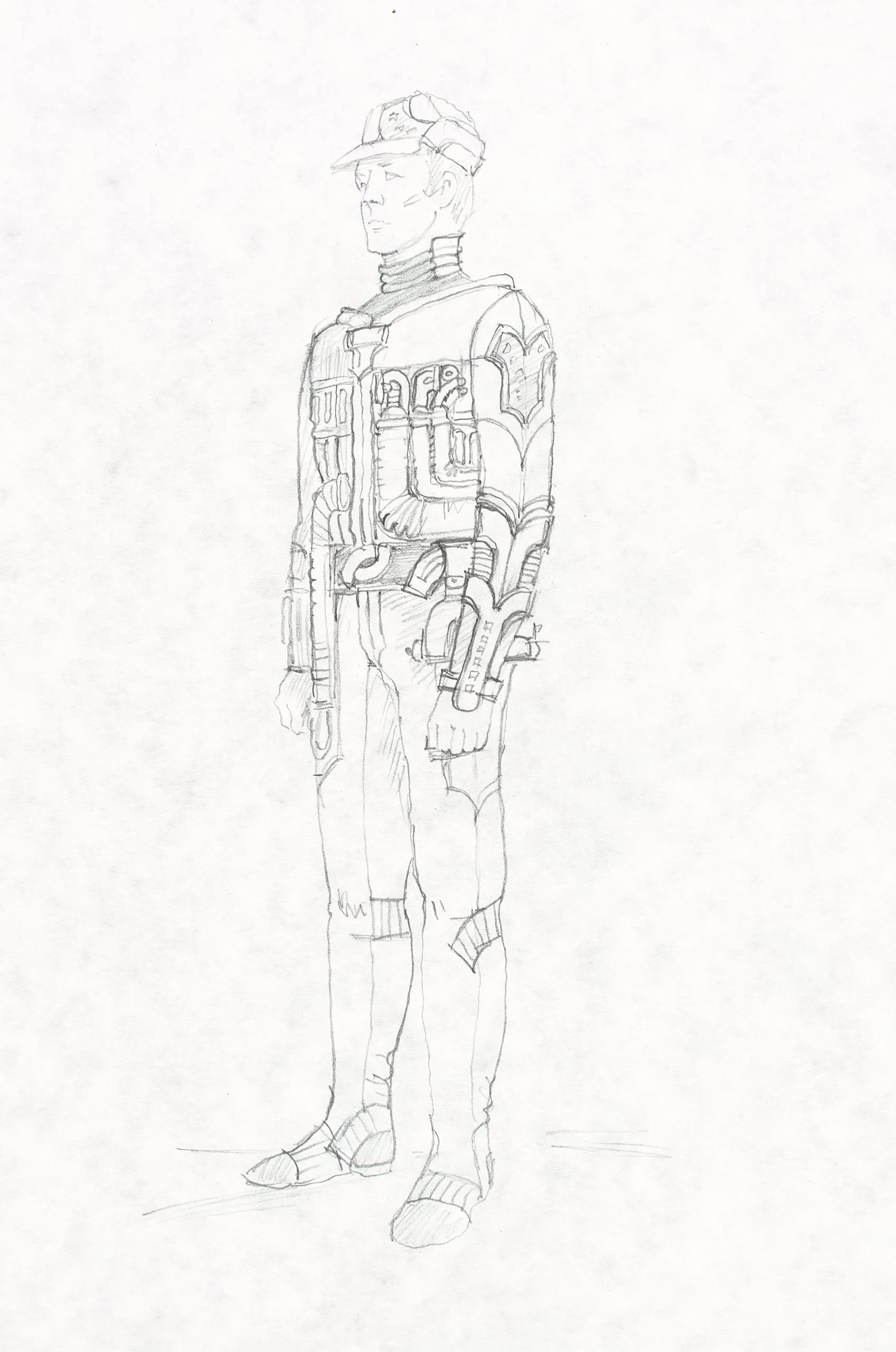 Pencil drawing on pale paper, full-length figure of a man in futuristic mechanical armor with a flat-brimmed cap, segmented chest plating, and a large ornamental shoulder pauldron