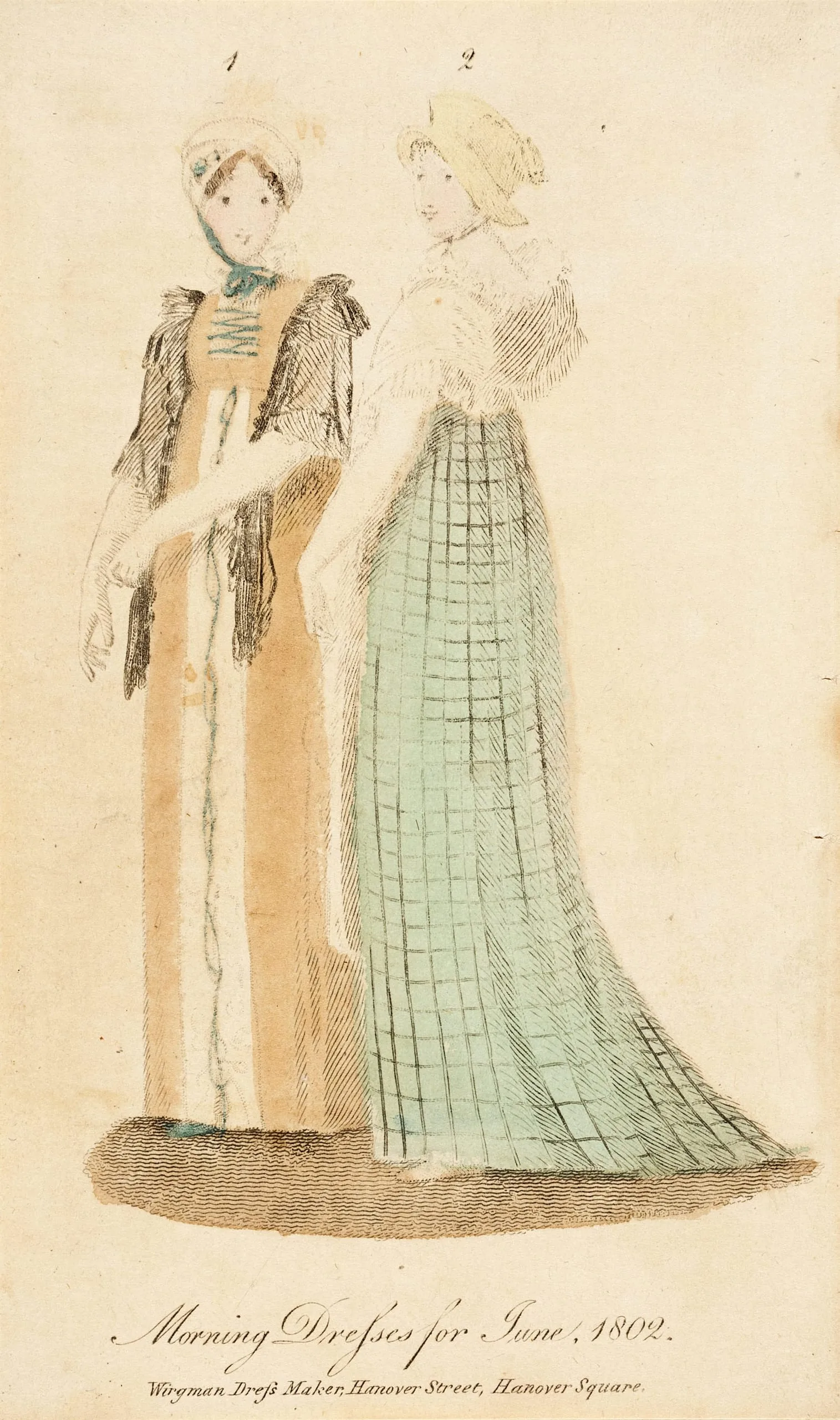 Fashion Plate, 'Morning Dresses for June, 1802' for 'Lady's Monthly Magazine'