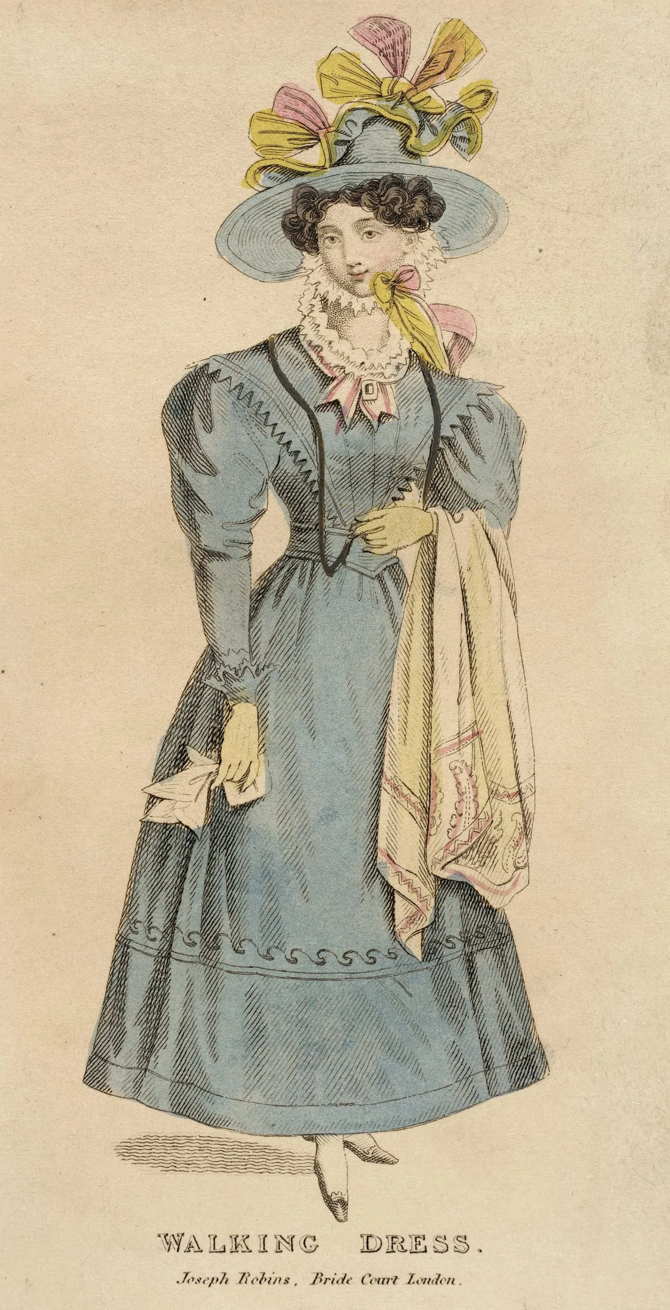 Hand-colored engraving of a full-length female figure in a slate-blue walking dress with oversized sleeves, wide-brimmed hat with ribbon bows, and lace ruff collar