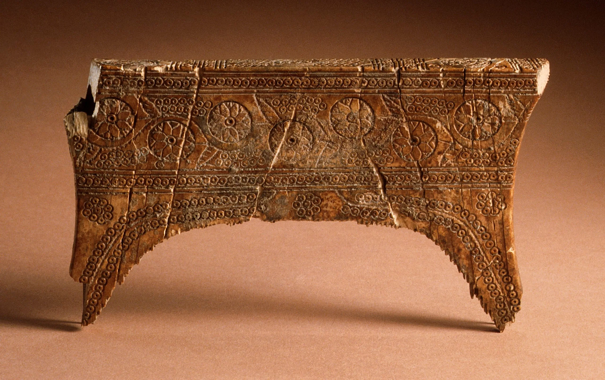 The comb is rectangular with concave sides. The teeth of this originally fine-toothed comb are now lost, probably due to breakage. The handle is ornamented with an incised horizontal panel with a coin border. It is filled with burgeoning lotus blossoms on scrolling vines that symbolize Buddhist concepts of purity, enlightenment, and paradise. Assimilated from Greco-Roman artistic conventions, scrolling vines with lotuses were often incorporated into Gandharan architecture as a design element, such as on a frieze in the Metropolitan Museum of Art, New York (13.96.24). On the curved sides flanges, willowy fronds with seed clusters and medallions gracefully encircle the mouth of the comb.