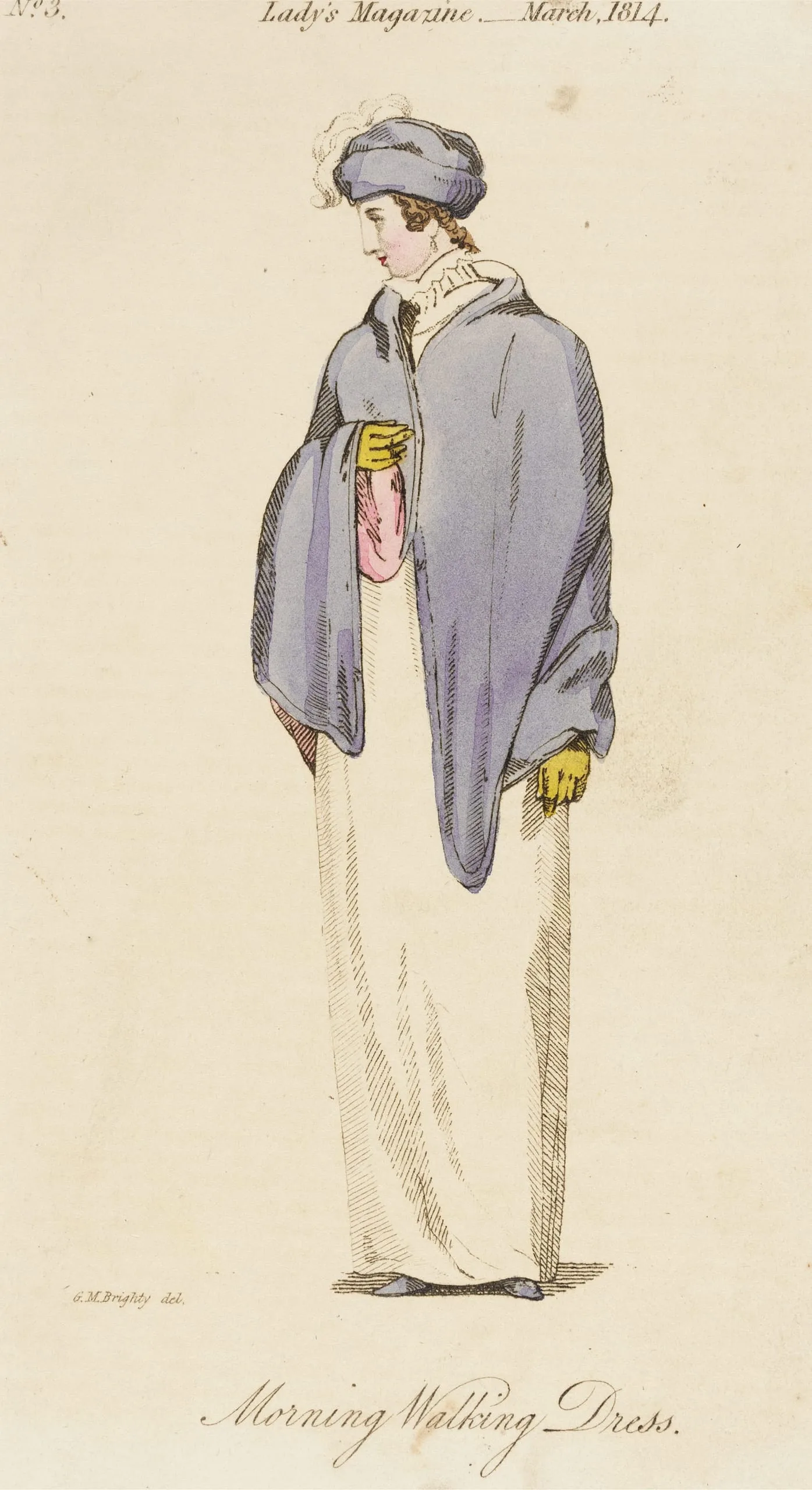 Hand-colored print from Lady's Magazine, March 1814, full-length fashion plate of a woman in a blue cape, cream skirt, and mustard gloves, facing left
