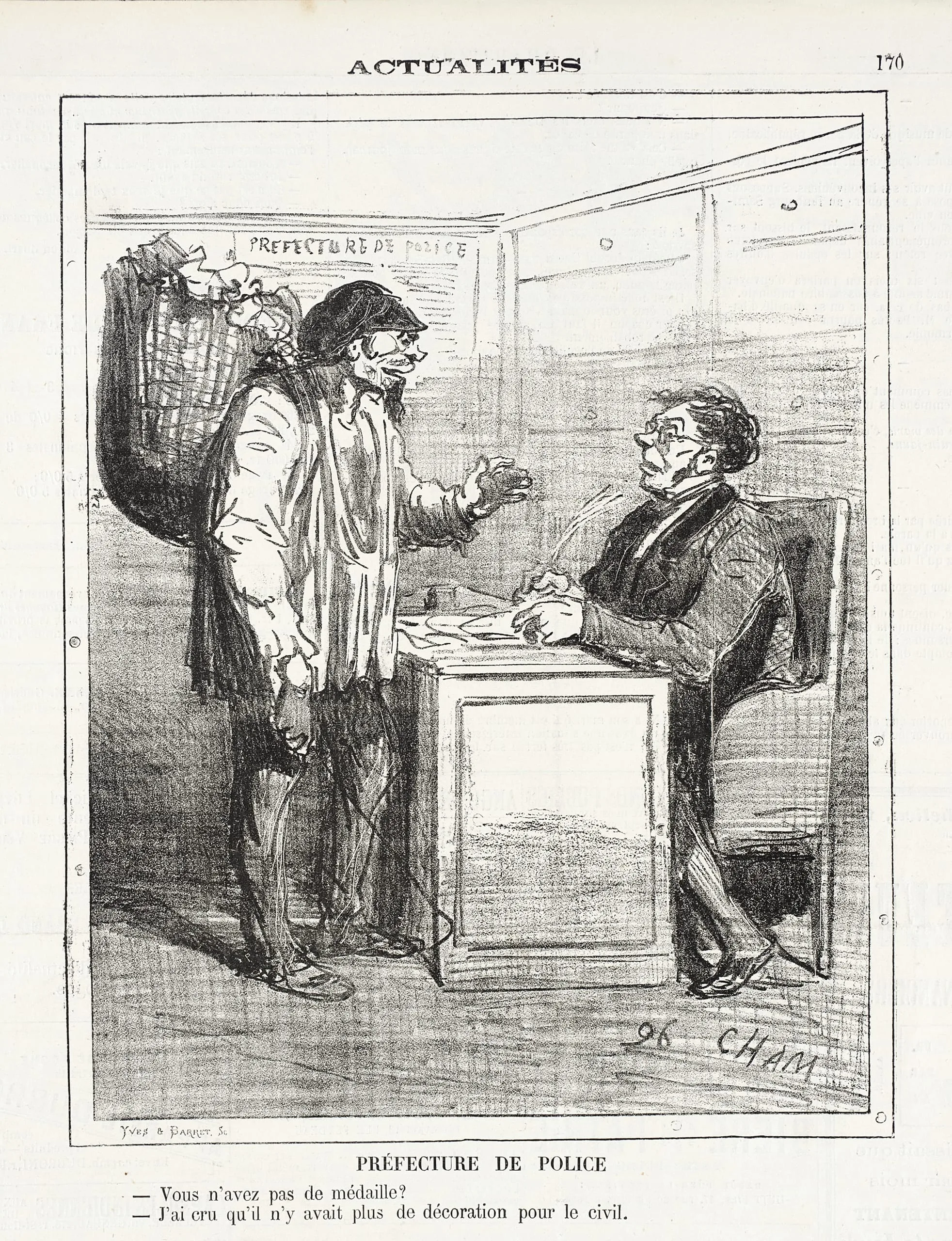 - Prefecture de police -Vous n'avez pas de médailles? -J'ai cru qu'il n'y avait plus de décoration pour le civil.