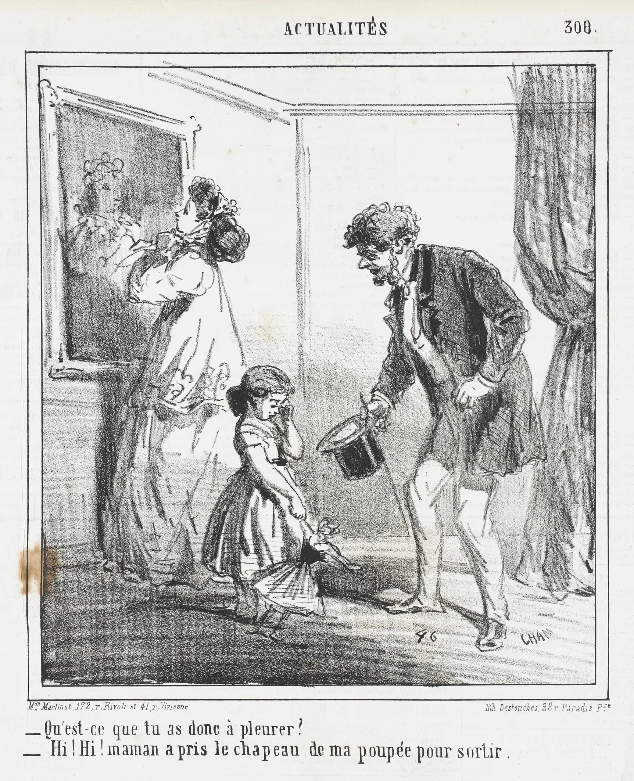 - Qu'est-ce que tu as donc à pleurer? -Hi! Hi! Maman a pris le chapeau de ma poupée pour sortir.