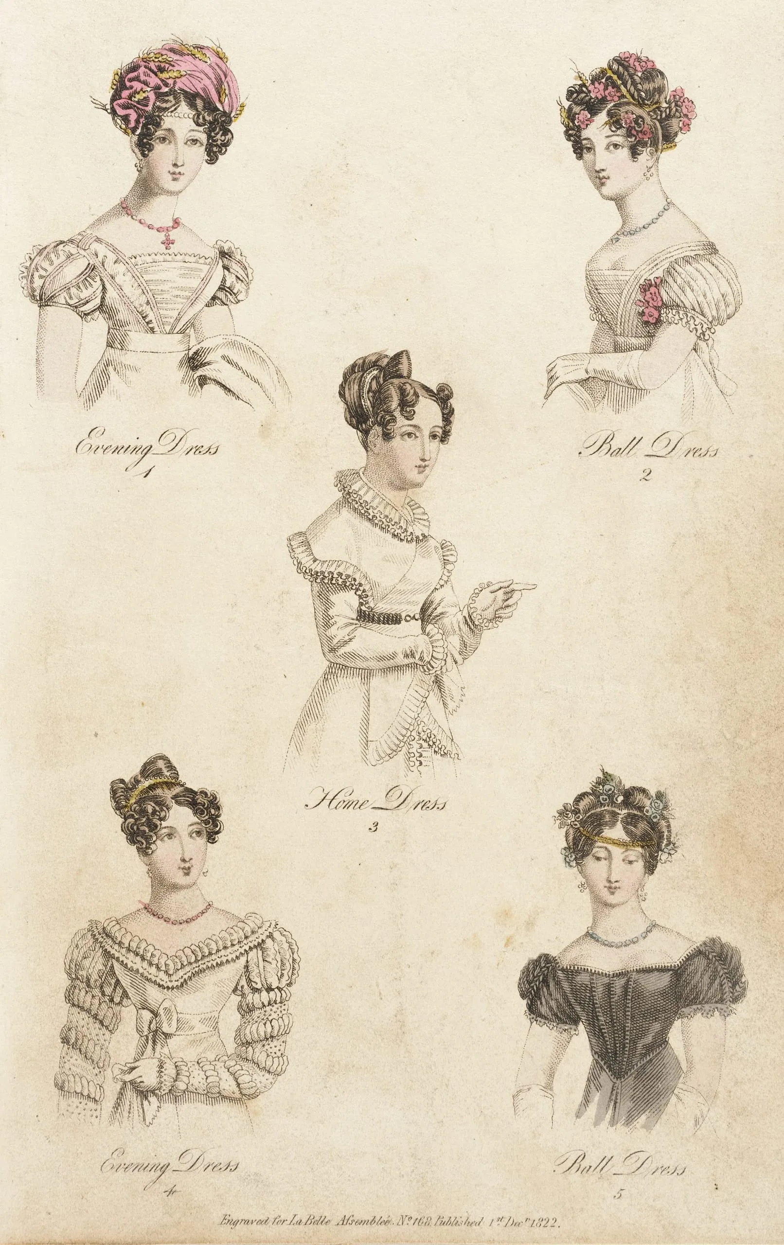 - Fashion Plate, 'Evening Dress/Ball Dress/Home Dress/Evening Dress/Ball Dress' for 'La Belle Assemblée'