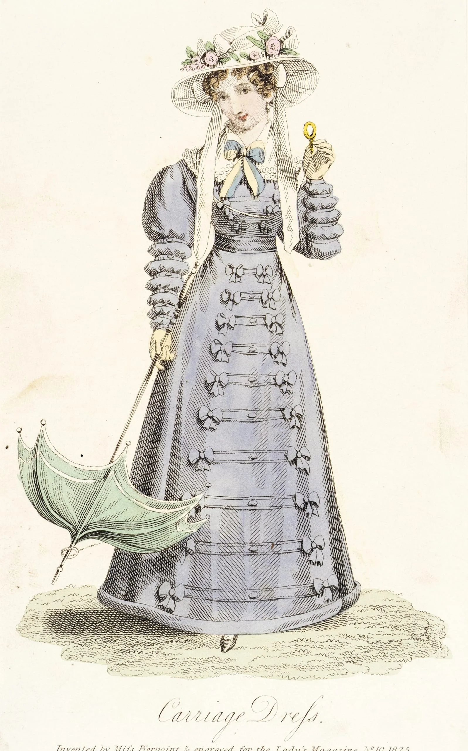 Hand-colored engraving of a full-length female figure in a periwinkle bell-skirted dress with bow trim, wide bonnet with roses, and a mint green closed umbrella, from a fashion magazine, 1825