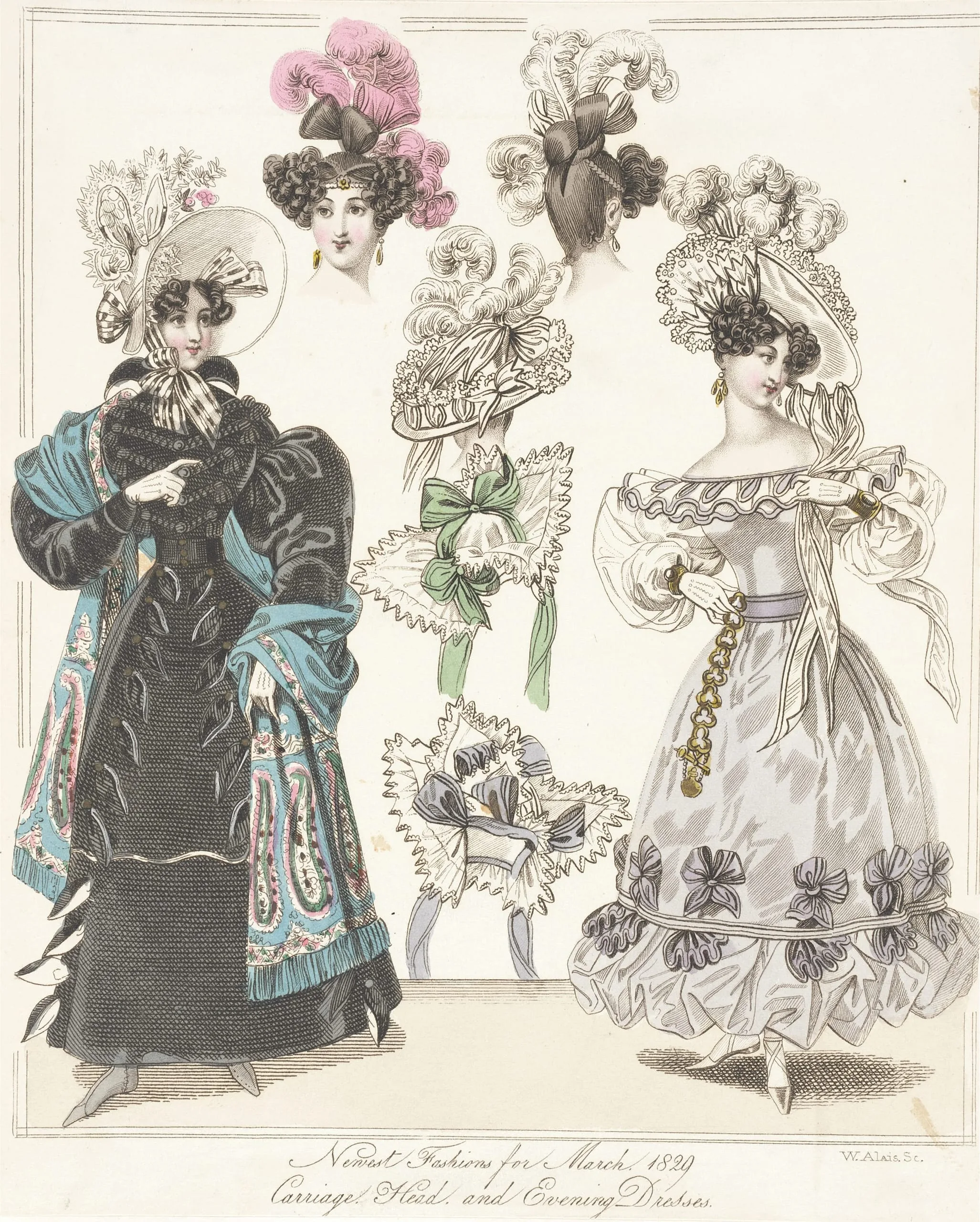 - Fashion Plate, 'Carriage, Head, and Evening Dresses' for 'The World of Fashion and Continental Feuilletons'