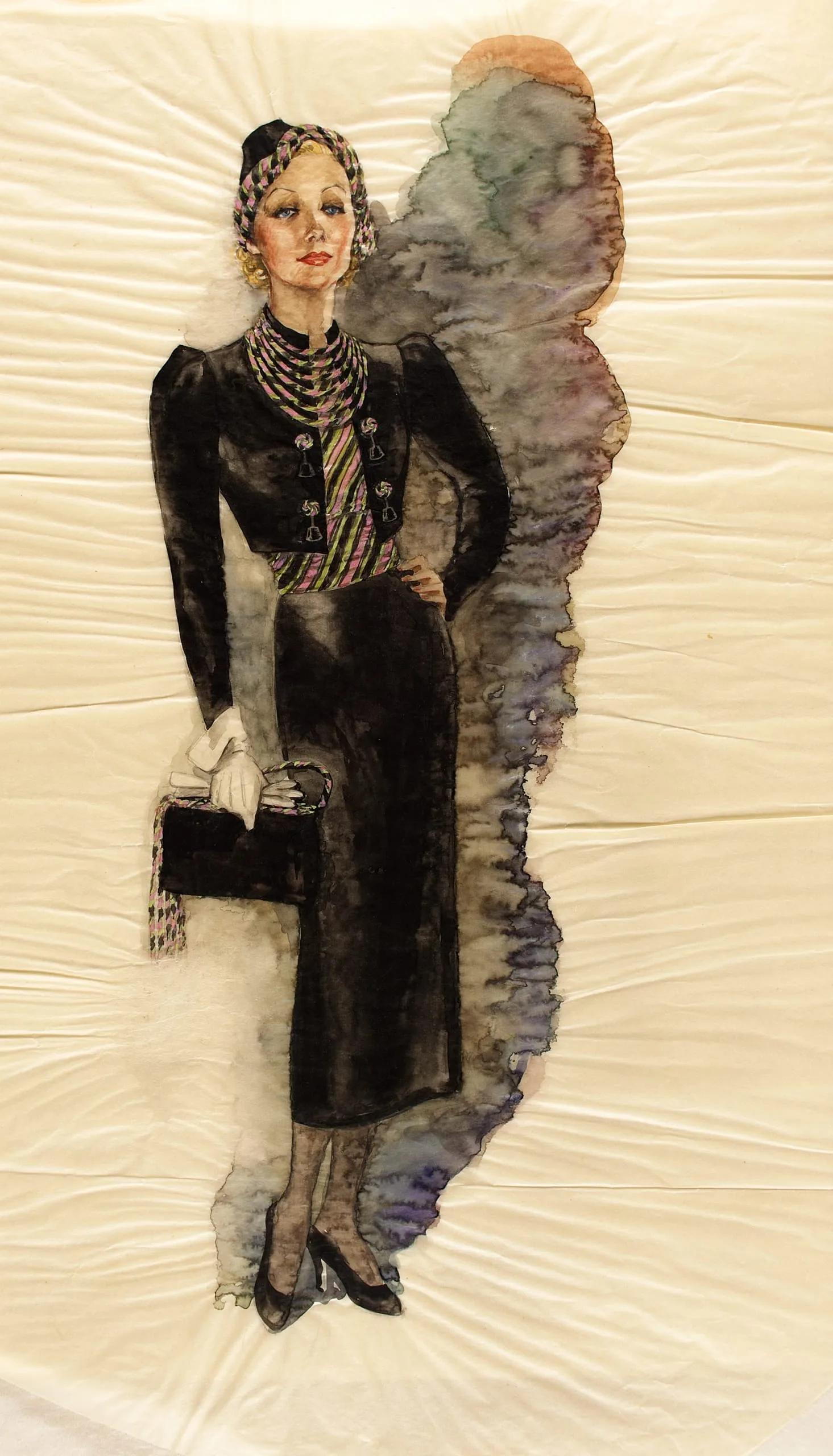 Watercolor fashion illustration of a full-length woman in a black dress and matching striped hat and scarf, mounted on pleated cream fabric, with loose color washes behind the figure