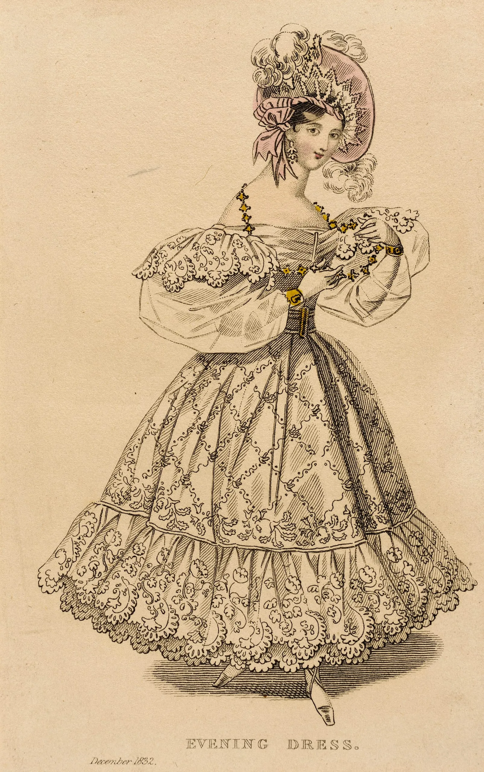 Hand-colored fashion print, December 1832, full-length figure of a woman in a wide-skirted off-the-shoulder evening gown with lace trim, voluminous sleeves, and a feathered bonnet
