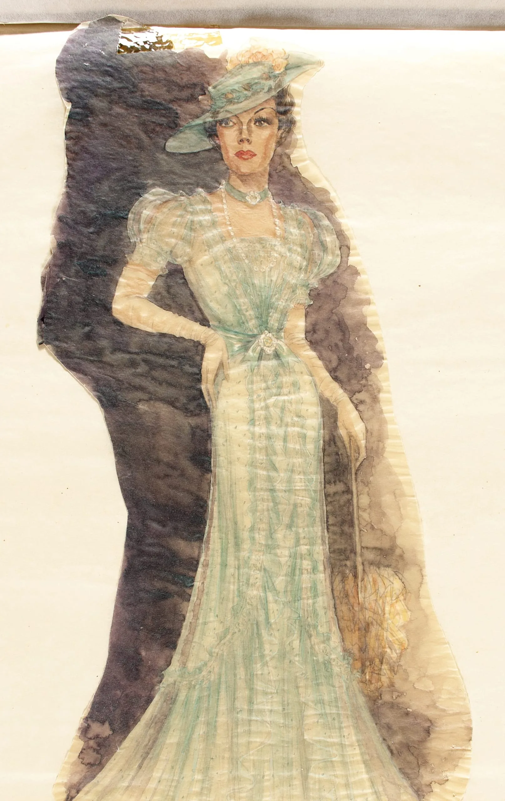 Watercolor costume design sketch of a full-length woman in a mint green Edwardian-style gown and wide-brimmed hat, cut out and mounted on cream paper with a purple-gray wash background