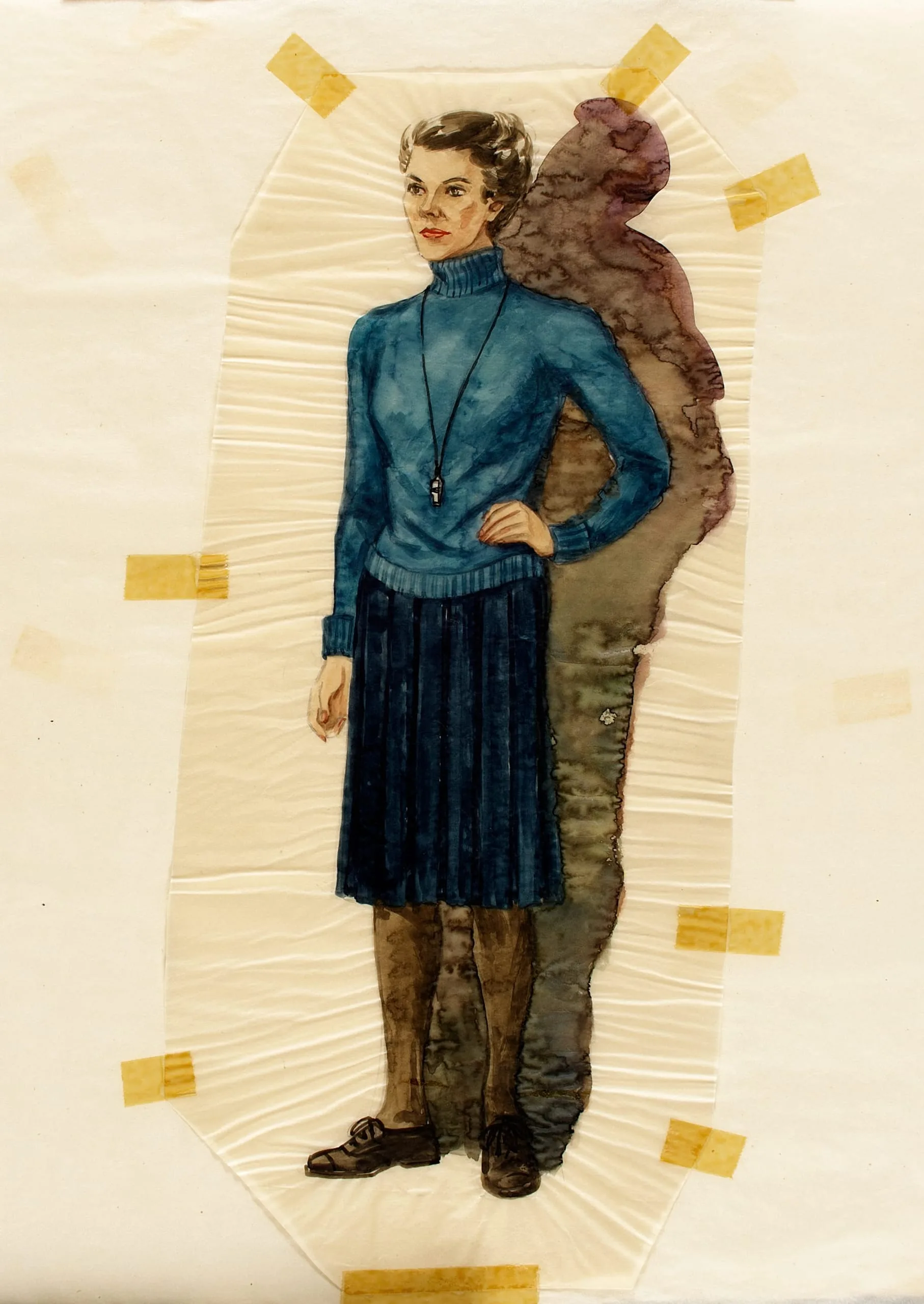 Watercolor fashion illustration, full-length standing woman in a teal turtleneck and navy pleated skirt, mounted on a pleated cream backing with visible tape