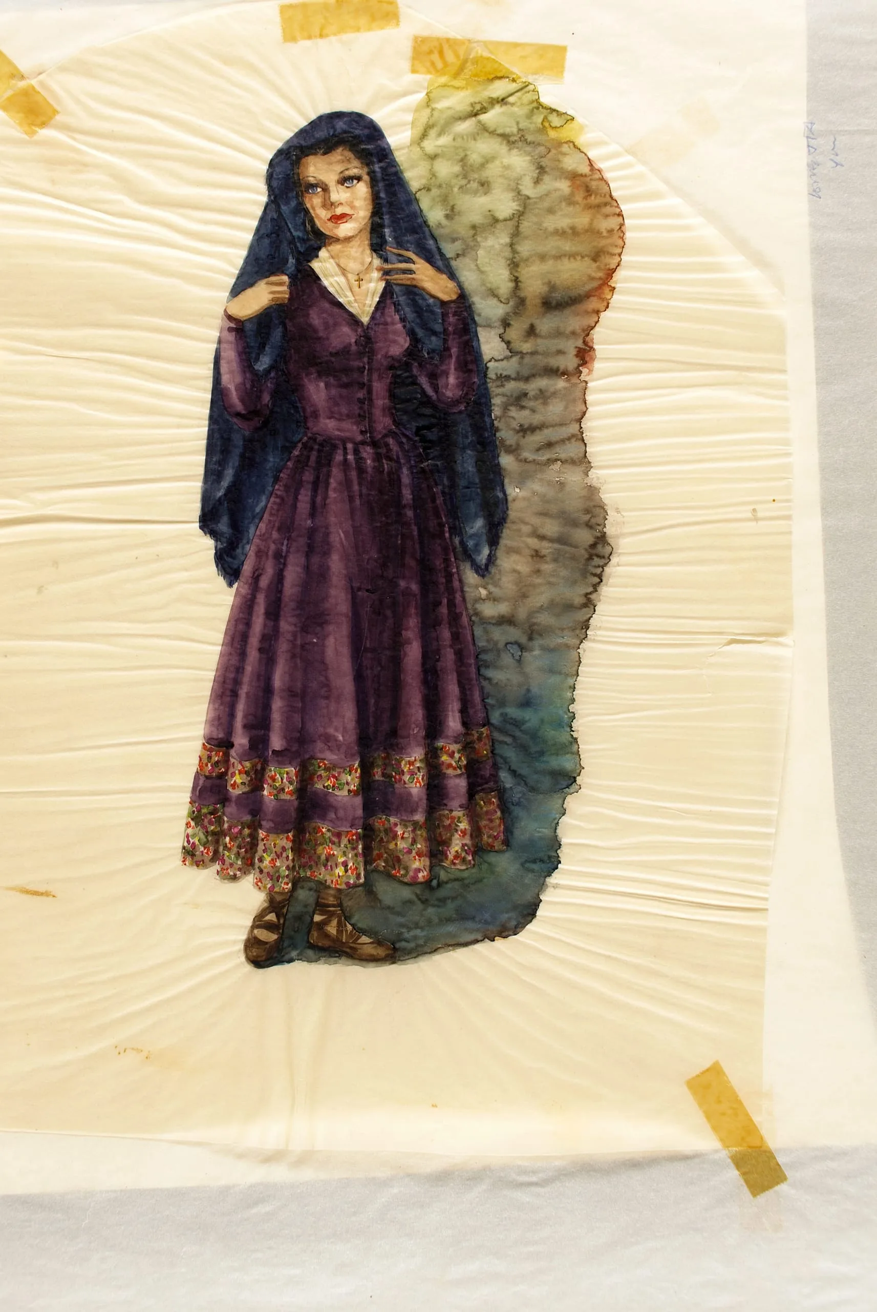 Watercolor costume design of a full-length standing woman in a deep purple dress with floral hem trim and navy blue veil, on wrinkled cream paper with amber tape at the corners