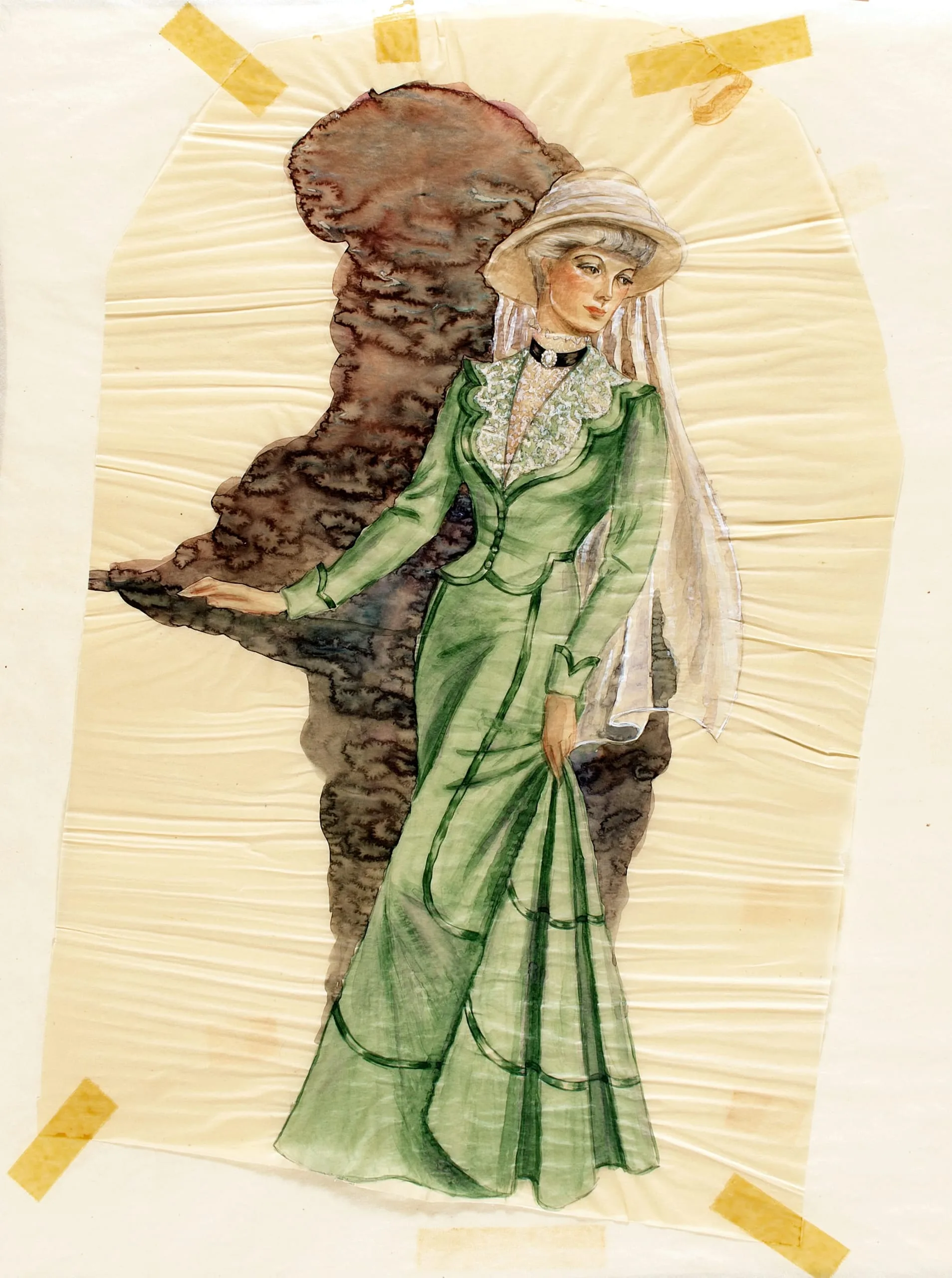 Watercolor and ink costume design on pleated cream paper showing a full-length woman in a tiered sage-green gown with lace bodice and wide-brimmed white hat with veil