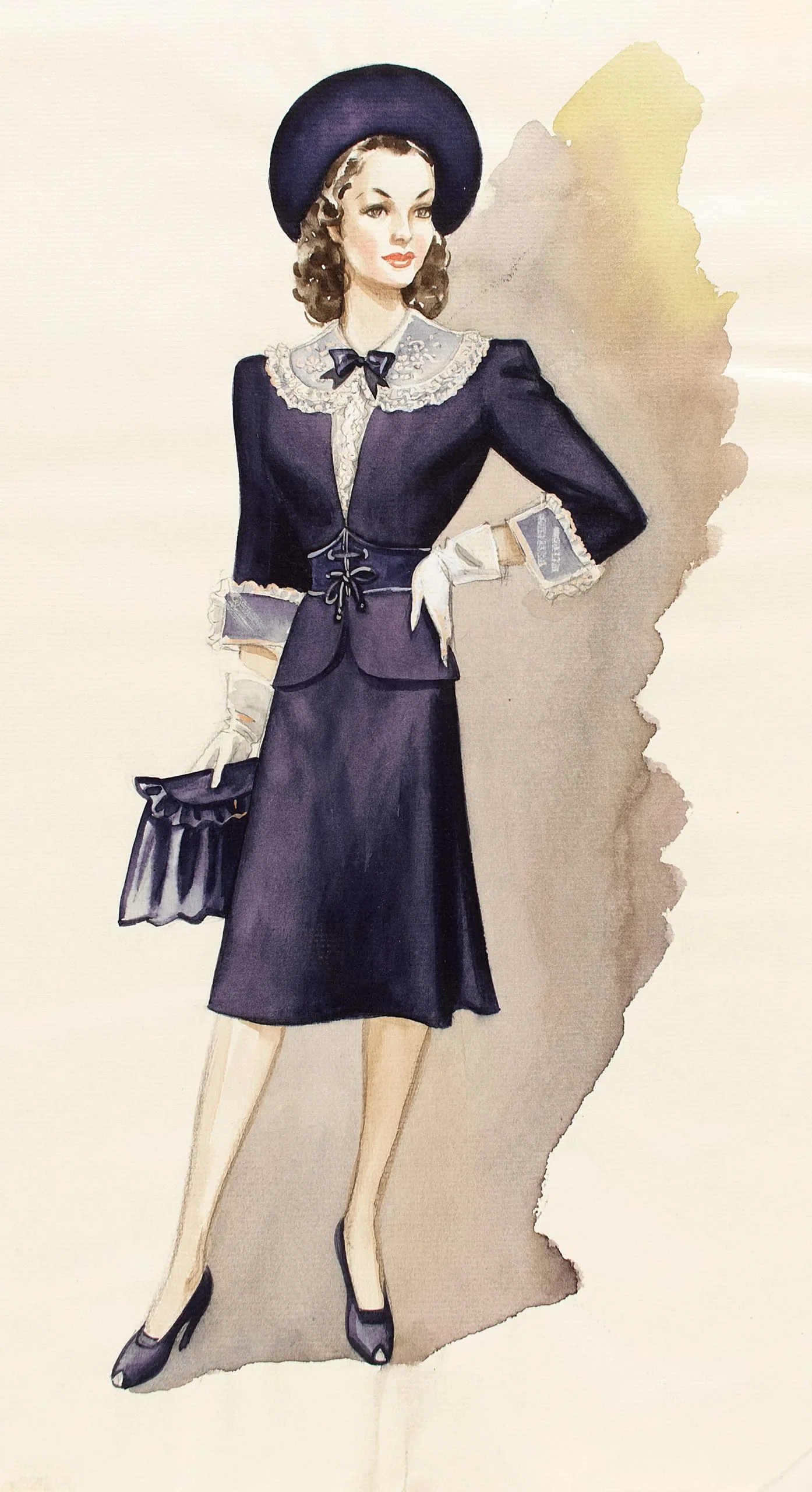 Watercolor fashion illustration, full-length figure of a woman in a navy blue skirt suit with lace collar and matching hat, clutch bag, and ivory gloves