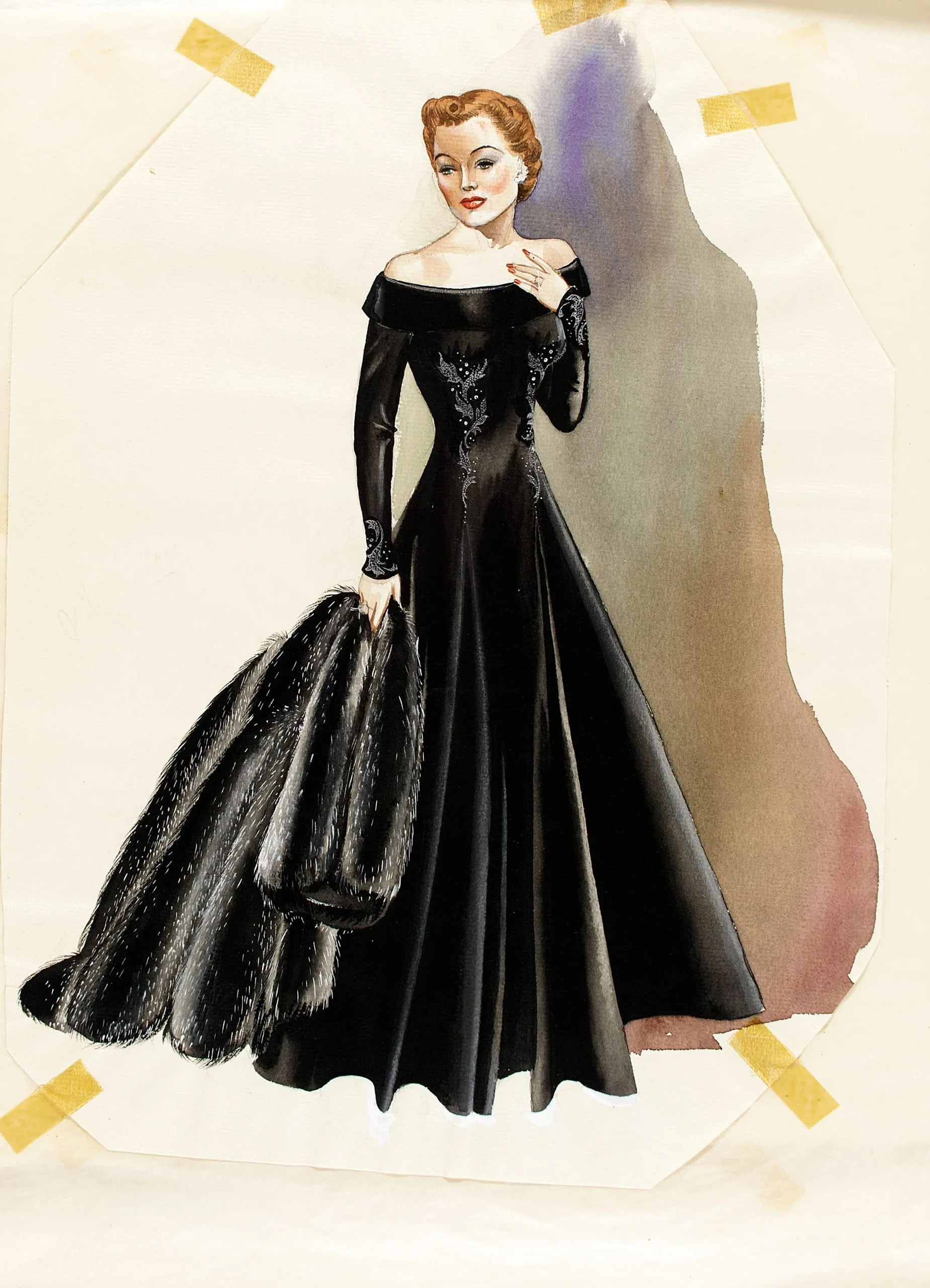 Full-length fashion illustration in watercolor and ink, woman in a black off-the-shoulder satin gown with beaded bodice, holding a dark fur stole