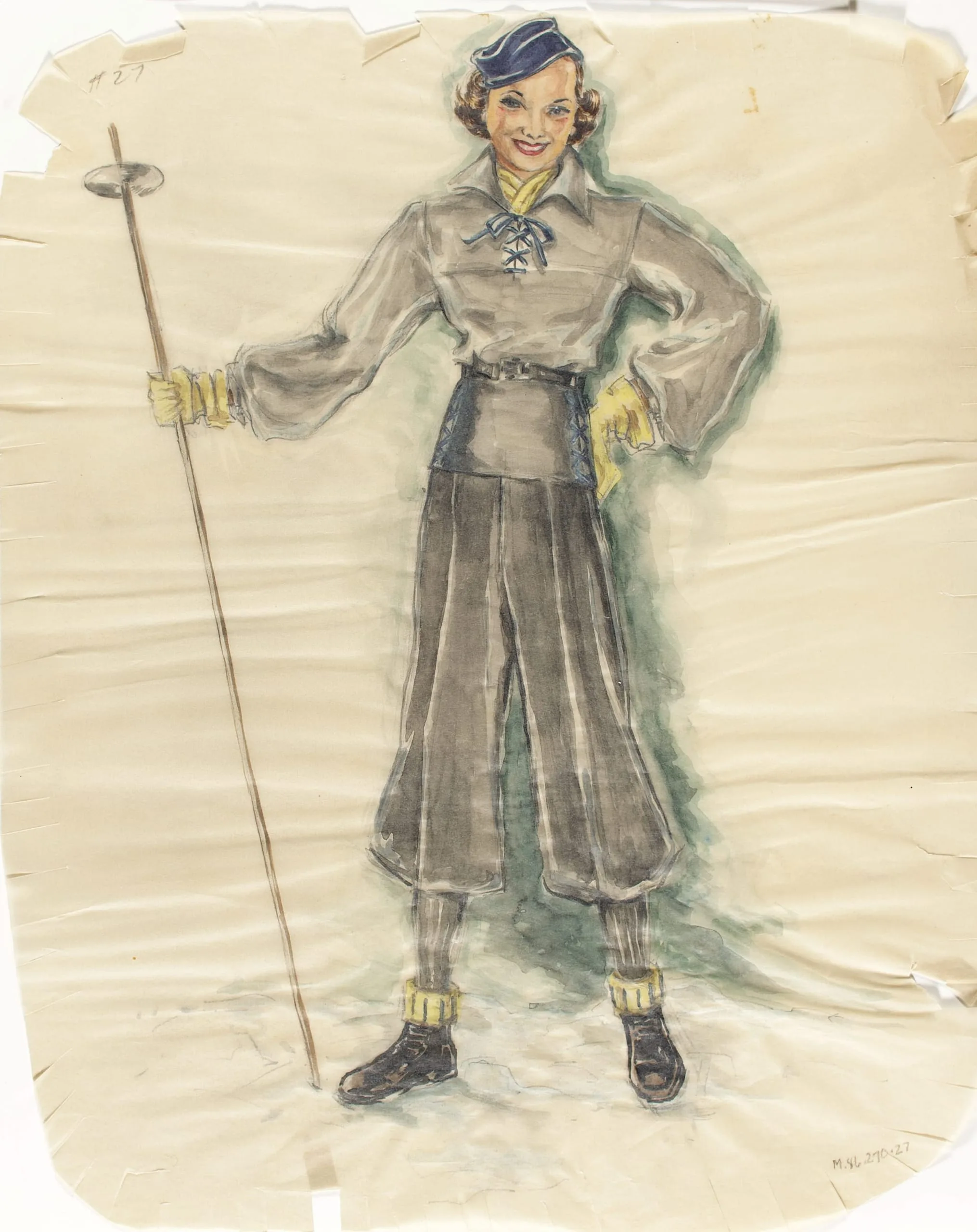 Watercolor and pencil fashion drawing of a full-length woman in a taupe ski outfit with navy blue accents, yellow gloves and socks, and a ski pole, on cream paper