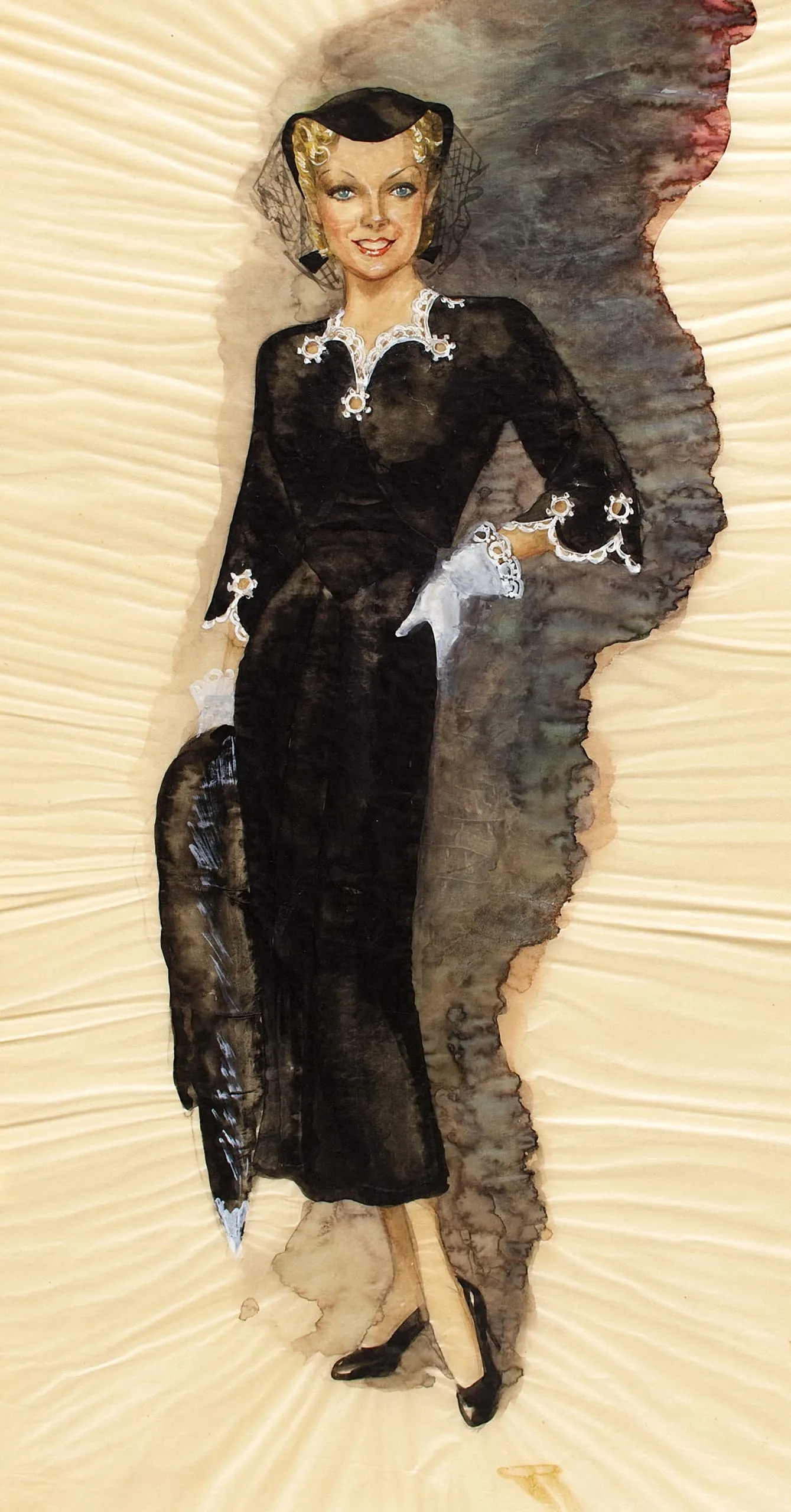Watercolor costume design of a full-length woman in a black fitted dress with white lace trim, holding gloves, set against a gray-brown wash on textured cream paper