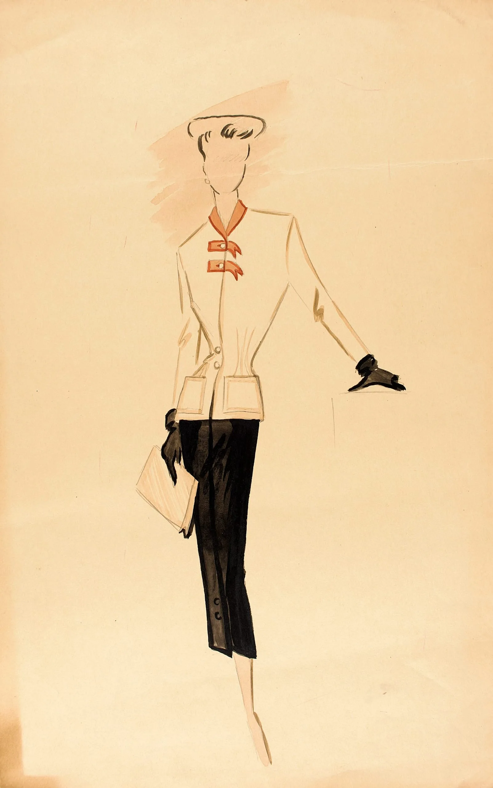 Fashion illustration in ink and watercolor on aged cream paper, full-length figure of a woman in a fitted white jacket with coral trim and black slim-cut trousers