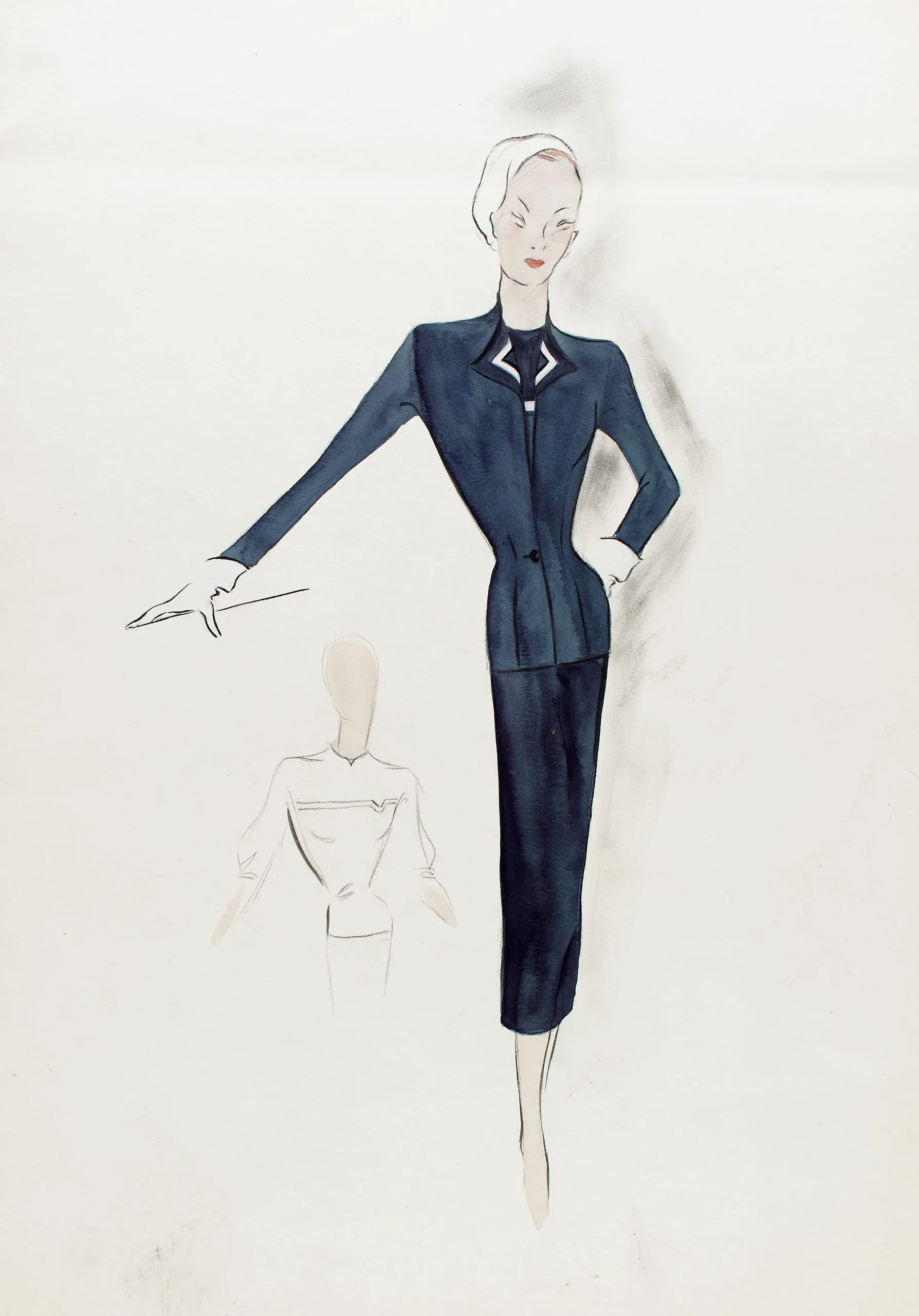 Fashion illustration in ink and watercolor, full-length female figure in a fitted navy two-piece suit with a back-view sketch in the lower left