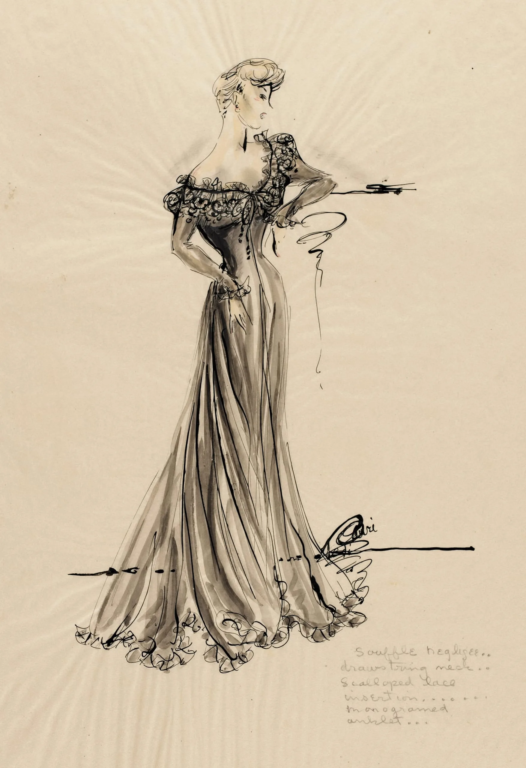 Fashion illustration in black ink and gray wash on cream paper, full-length profile of a woman in a floor-length off-shoulder evening gown with ruffled trim and lace detail, with handwritten annotations