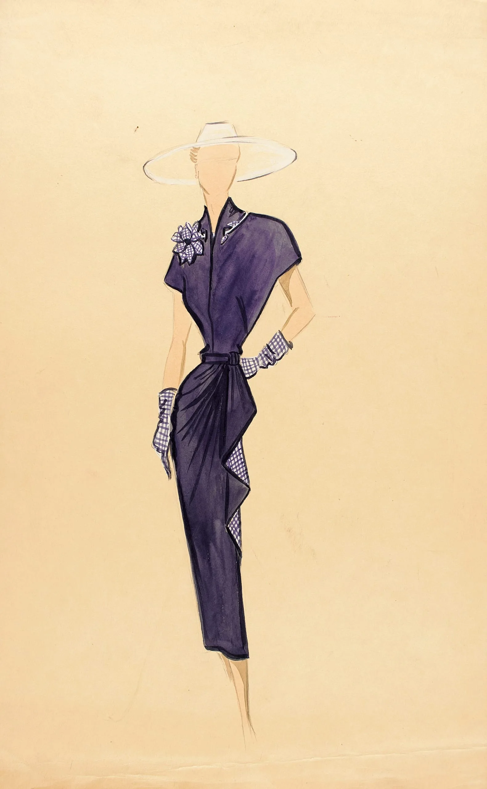 Fashion illustration in ink and watercolor on peach paper, full-length faceless female figure in a deep indigo wrap dress with gingham trim and a wide-brimmed white hat
