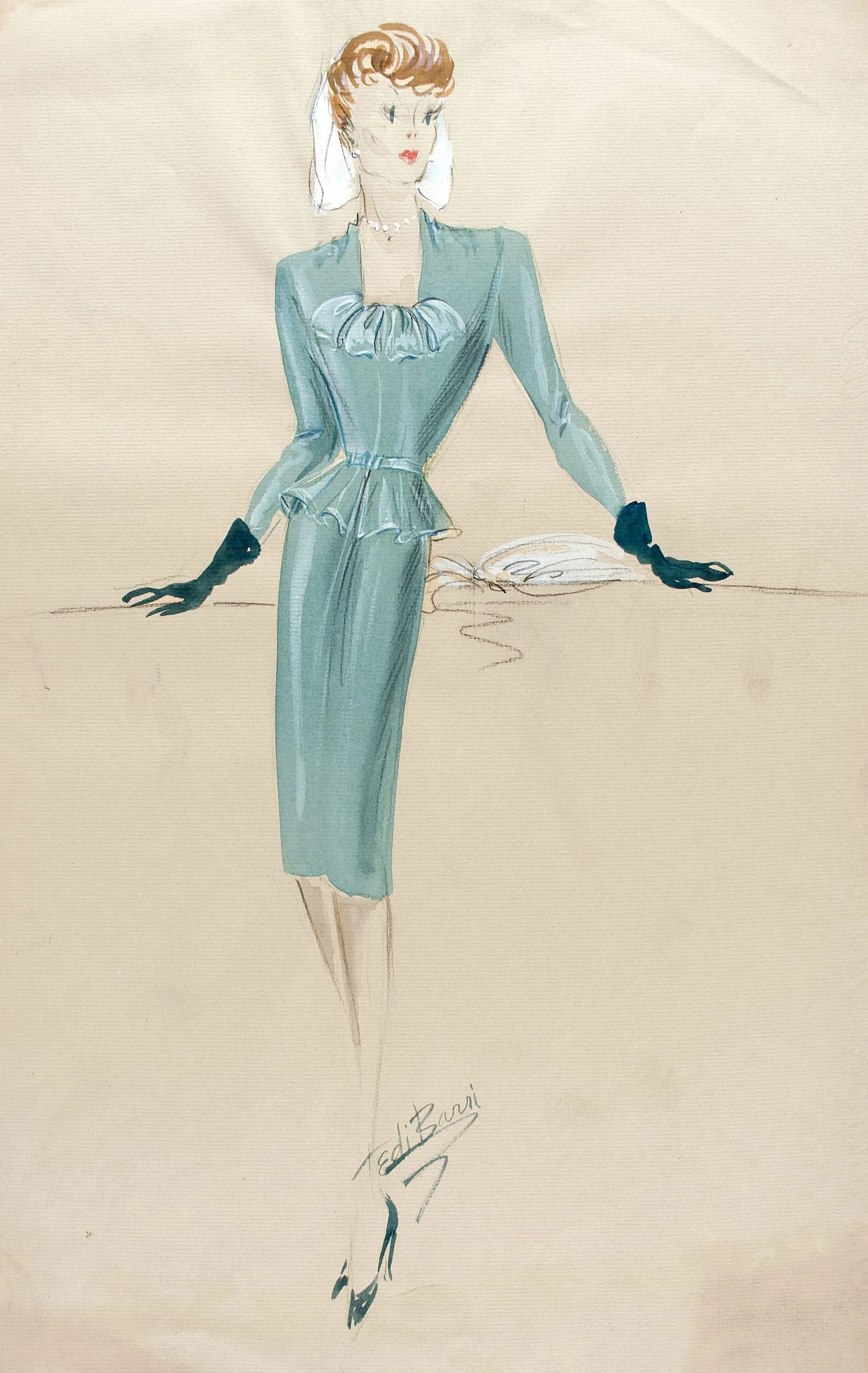 Fashion illustration in ink and watercolor on cream paper, a woman in a fitted seafoam-teal peplum dress with dark gloves and white clutch, rendered in loose brushwork