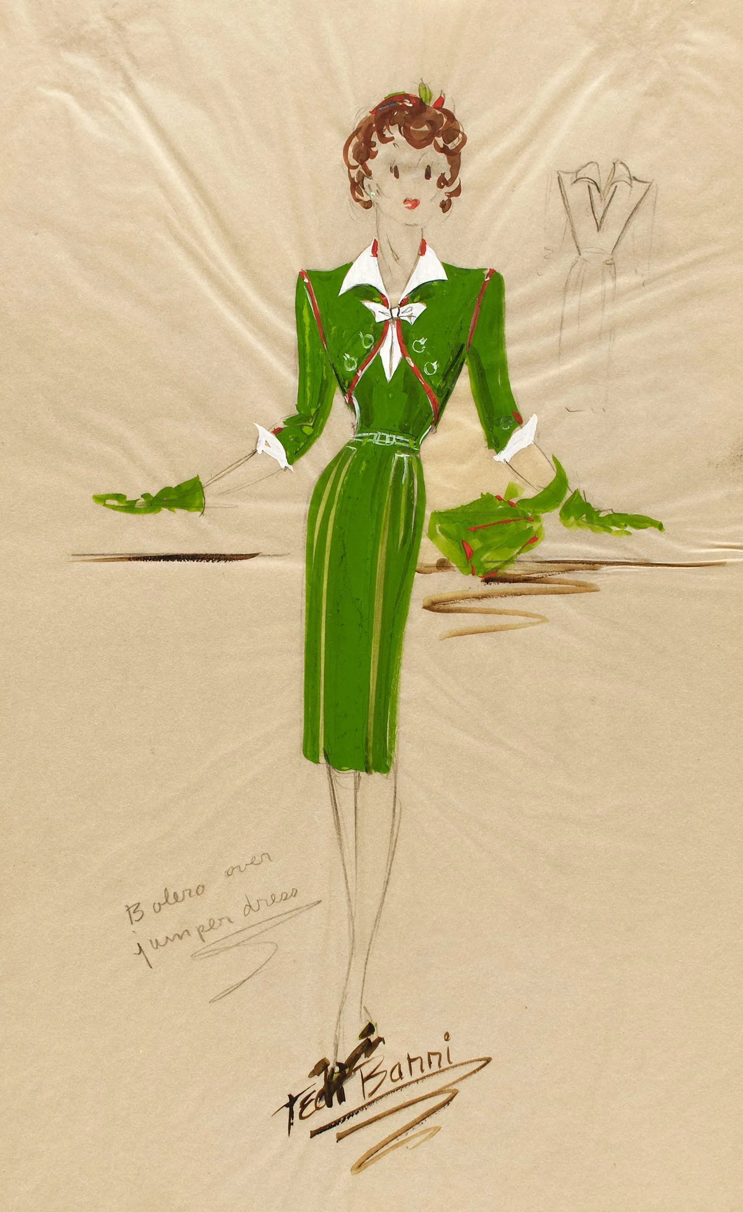 Fashion illustration in gouache and pencil on cream paper, full-length figure of a woman in a kelly green bolero jacket and matching dress with red trim and white gloves