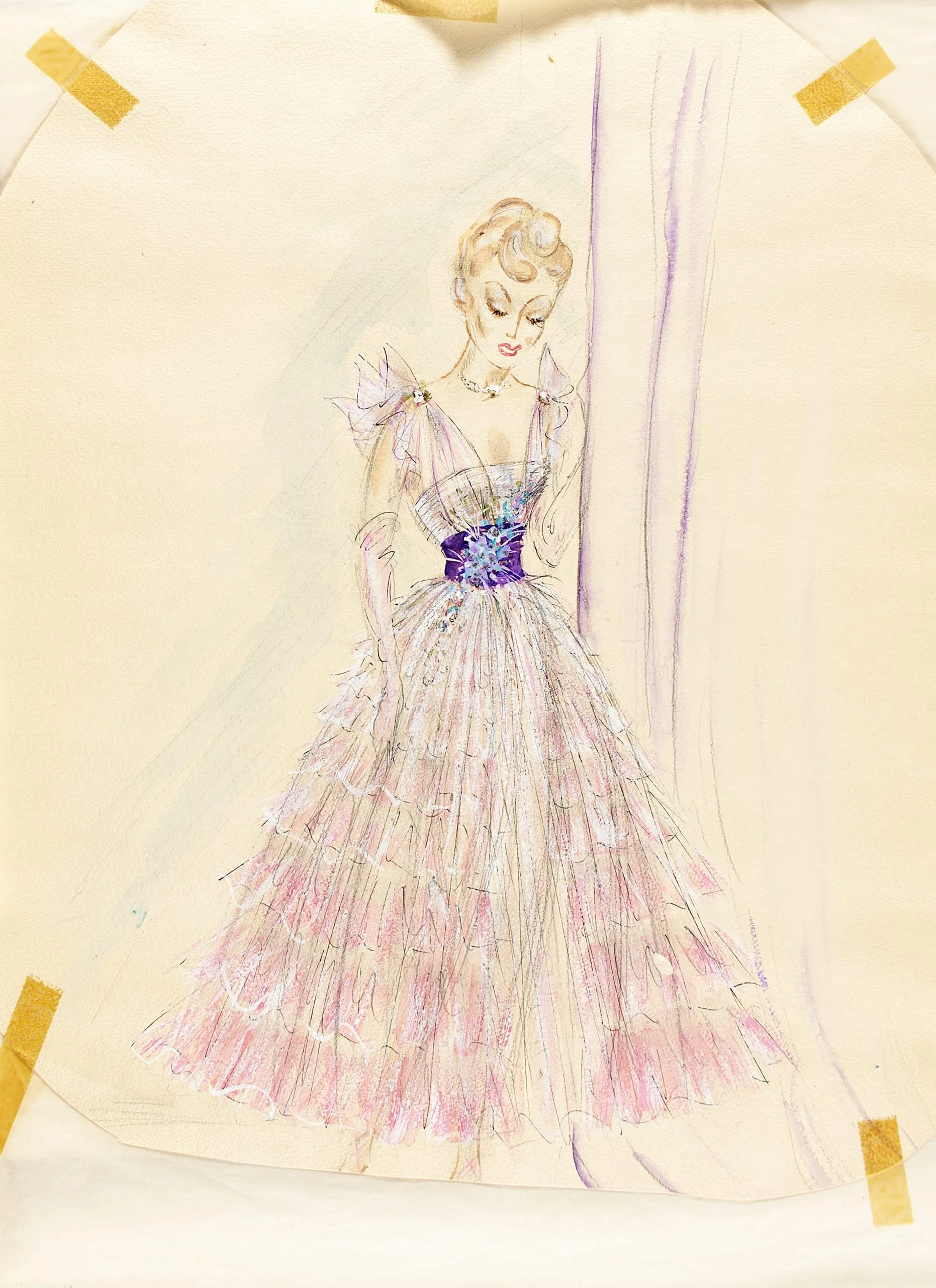 Fashion illustration in ink and watercolor on cream paper, full-length figure of a woman in a tiered ball gown with a purple sash and bow-accented shoulders